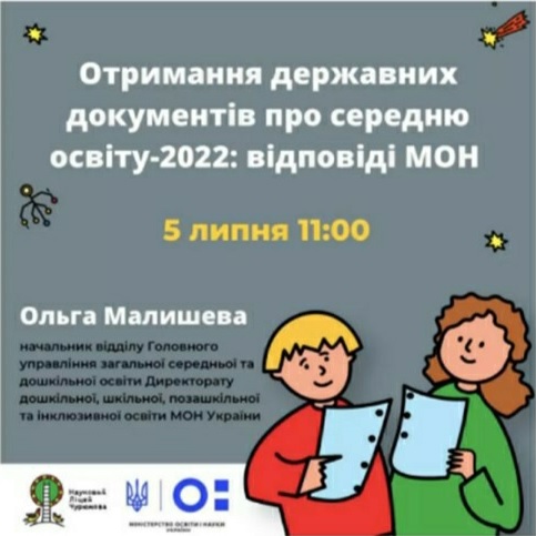 5 липня 2022 р. за участю Міністерства освіти і науки України та за підтримки громади м. Рочестер (США), благодійної організації “Рочестер Майдан”/”RocMaidan (США) відбувся вебінар «Отримання державних документів про середню освіту - 2022: відповіді МОН». Про видачу державних документів 2021-2022 н.р. розповіла Ольга МАЛИШЕВА, начальник відділу Головного управління загальної середньої та дошкільної освіти Директорату дошкільної, шкільної, позашкільної та інклюзивної освіти Міністерства освіти і науки України, та Ірина ЖДАНОВА, засновниця та директорка Наукового ліцею «Міжнародна Зелена школа ім. Клима Чурюмова», координаторка Громадянської платформи з реформування наукової сфери в Україні, член ГО «Фонд «Відкрита політика». |