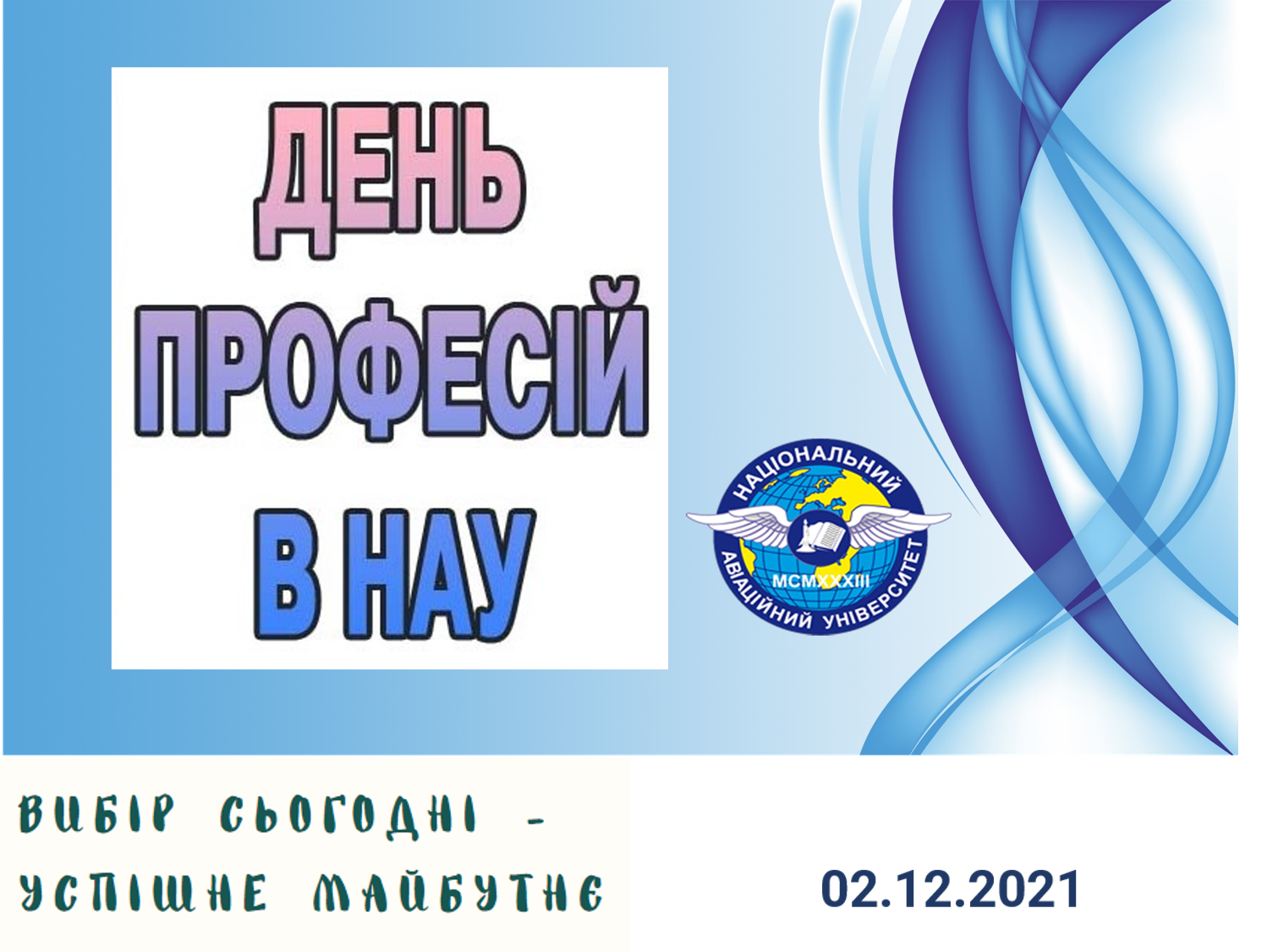 Національний авіаційний університет запрошує учнів 9-11 класів і студентів коледжів на «День професій в НАУ», що відбудеться 02 грудня 2021 року о 14:00 в онлайн форматі на платформі Zoom.