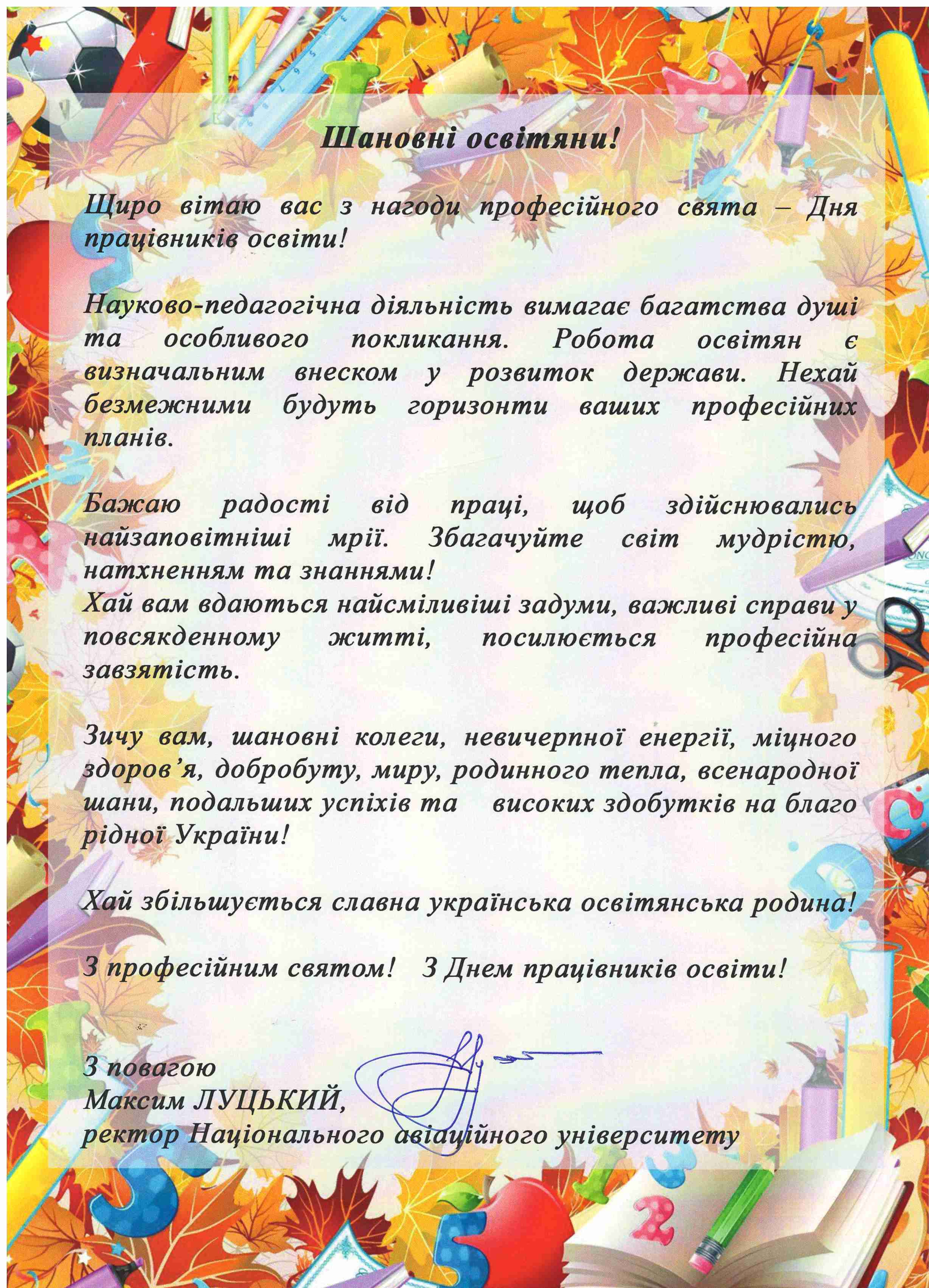 Шановні освітяни! Щиро вітаю вас з нагоди професійного свята – Дня працівників освіти!      Науково-педагогічна діяльність вимагає багатства душі та особливого покликання. Робота освітян є визначальним внеском у розвиток держави. Нехай безмежними будуть горизонти ваших професійних планів.