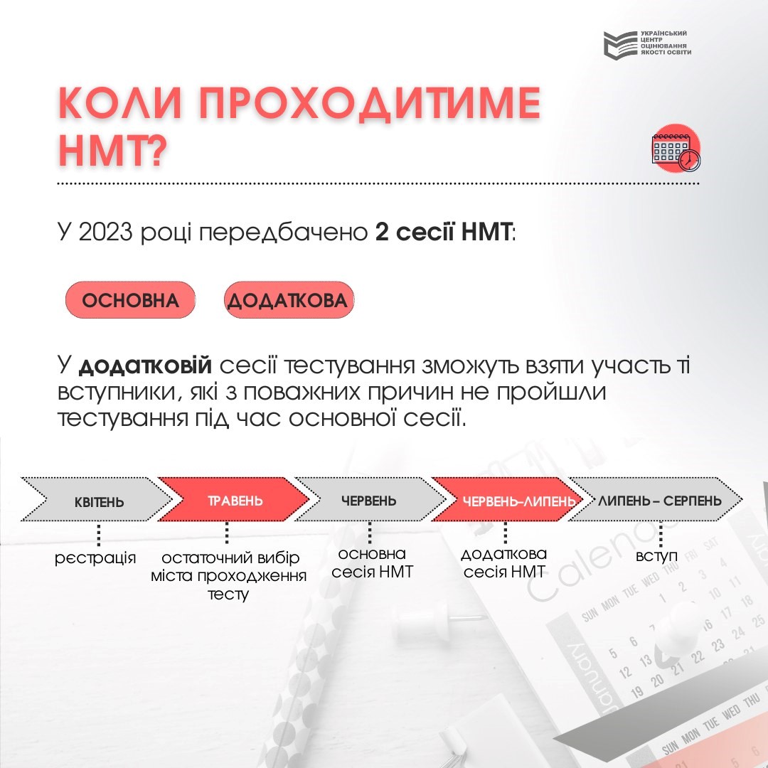 Наразі передбачено проведення двох сесій НМТ: основної і додаткової. Основна сесія НМТ триватиме з 5 по 23 червня. Додаткову сесію НМТ проведуть з 11 до 24 липня. У додатковій сесії тестування зможуть узяти участь ті вступники, які з поважних причин не пройшли тестування під час основної сесії.