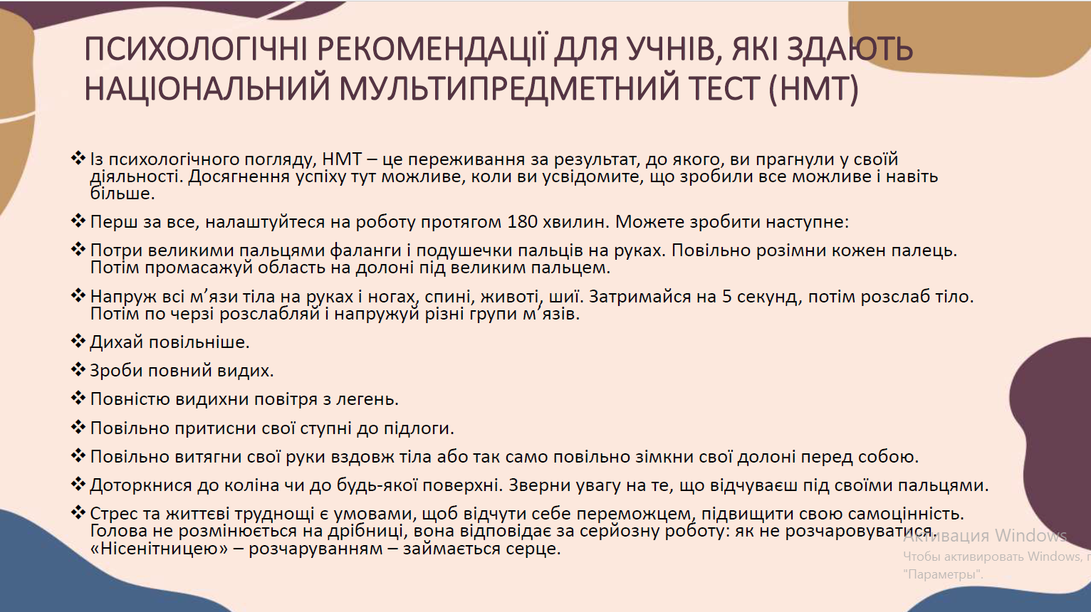 · усвідомленно підійти до вибору майбутньої спеціальності; · успішно підготуватися і скласти національний мультипредметний тест; · отримати вичерпну інформацію про вступну кампанію та реєстрацію на НМТ; · адаптуватися і швидко подолати проблеми першого року навчання у вищому навчальному закладі. |
