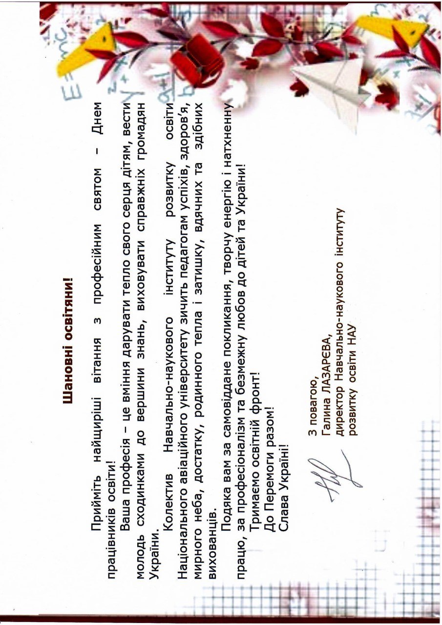 Привітання директора Навчально-наукового інституту розвитку освіти НАУ з Днем працівників освіти!