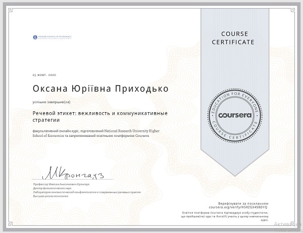 25 жовтня 2020 року надійшов сертифікат кандидату педагогічних наук, доценту, доценту кафедри базових і спеціальних дисциплін Оксані Приходько про успішне завершення факультативного онлайн-курсу «Мовний етикет: увічливість і комунікативні стратегії», підготовлений National Research University Higher School of Economics. Курс акумулює теоретичний і практичний досвід вивчення надважливих у сучасному суспільстві механізмів і технології ведення комунікації. Містить практичну компоненту, націлену на вдосконалення мовленнєвої компетентності, а також ідентифікацію маніпулятивних стратегій і тактик.