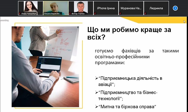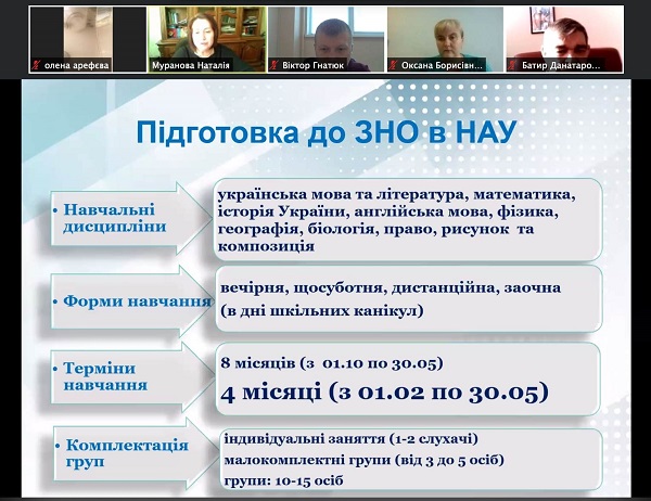 Модератор онлайн зустрічі професор Наталія Муранова, директор Інституту інноваційних освітніх технологій НАУ ознайомила вступників з особливостями проведення загальнодержавного ЗНО-2021, зосередила увагу на шляхах якісної підготовки задля отримання рейтингового сертифікату, розкрила переваги участі учнівської молоді у Всеукраїнських олімпіадах НАУ та презентувала освітні, наукові й профорієнтаційні проекти, що сприятимуть орієнтиром у виборі майбутньої професії.