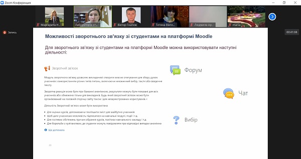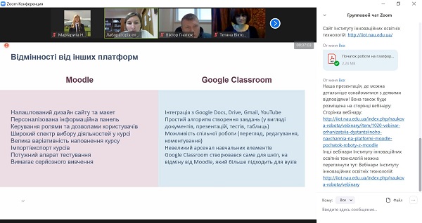 Також було дано відповіді на запитання учасників вебінару, що дозволило додатково розглянути організаційну структуру сайту https://moodle.nau.edu.ua, технічні можливості платформи Moodle, її відмінності від Google Classroom, створення тестових завдань із ключами для автоматичної перевірки робіт студента та можливості зворотнього зв’язку зі студентами.