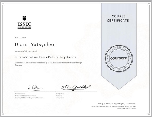 Цього разу фахівець Центру учнівської обдарованої молоді Діана Яцишин успішно завершила 4-тижневий курс «International and Cross-Cultural Negotiation» від ESSEC Business Schoo на платформі Coursera.