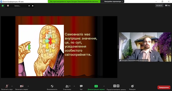 На проведеному вебінарі ми розглянули теоретико-практичний аспект самоаналізу та рефлексії. Самоаналіз – вивчення людини самого себе, свого внутрішнього світу і глибин своєї психіки, як би «погляд з середини». Суб'єкт самоаналізу, тобто учень, або дорослий, аналізує свою діяльність і свої дії на уроці. Завданням самоаналізу є виявлення особливостей власної навчальної діяльності, виявлення успішно застосованих методів навчання, фіксація отриманих результатів, встановлення їх відповідності поставленим цілям і ситуаціям. Самоаналіз необхідний для переходу до оцінки власної діяльності, її коригуванні в подальшому, плануванні кроків самовдосконалення. Рефлексія й самоаналіз ці два процеси йдуть поруч. Рефлексія – самоспостереження, роздум над своїми переживаннями і думками. Це щось нове, до чого прагне сучасна педагогіка: вчити не науці, а вчити вчитися. Рефлексія допомагає дитині не тільки усвідомити пройдений шлях, а й вибудувати логічний ланцюжок, систематизувати отриманий досвід.