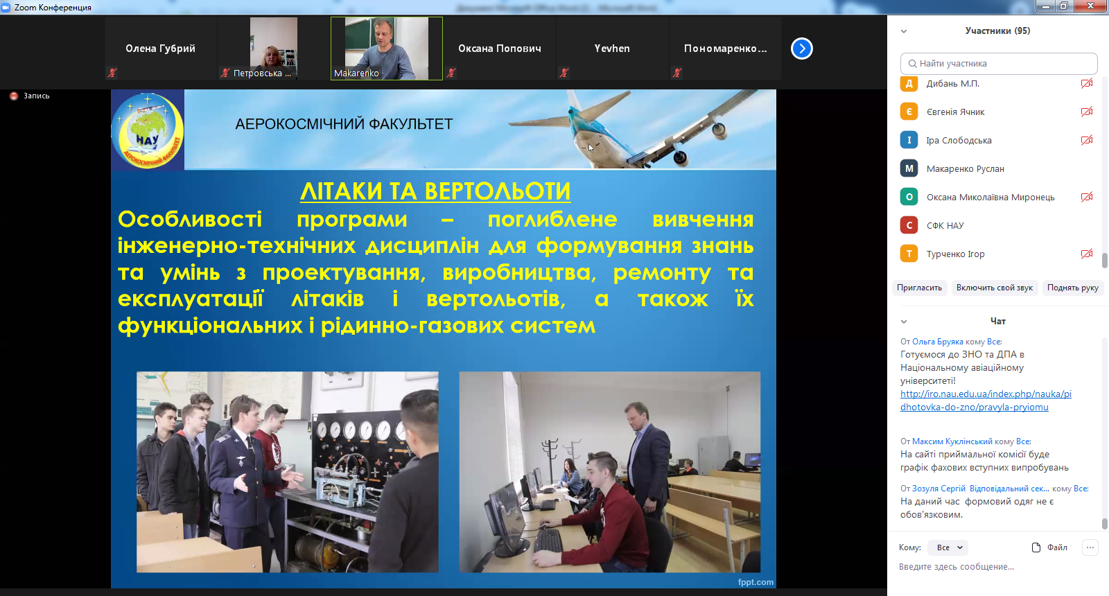 Науковці НАУ демонстрували презентації, ділилися досвідом і знаннями, детально ознайомили учасників заходу із закладом, презентували діяльність факультетів університету, розповіли про переваги навчання в НАУ, про досягнення та дозвілля студентів, розкрили важливі питання, висвітлили максимальну інформацію для випускників та запросили вступати до Національного авіаційного університету – одного з найпрестижніших вищих навчальних закладів в Україні.
