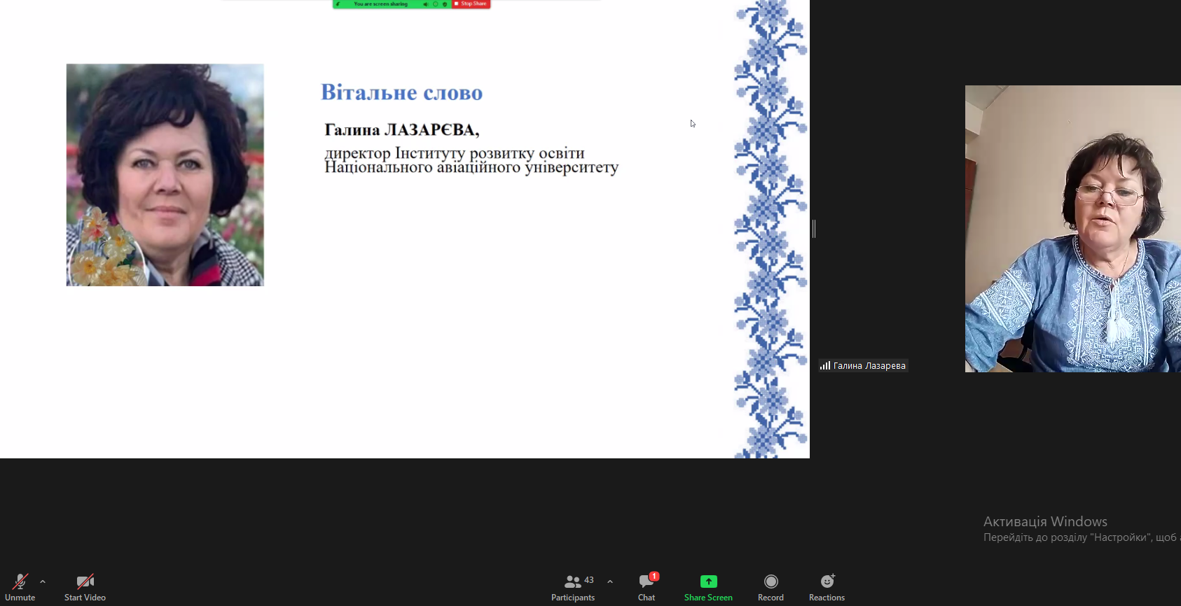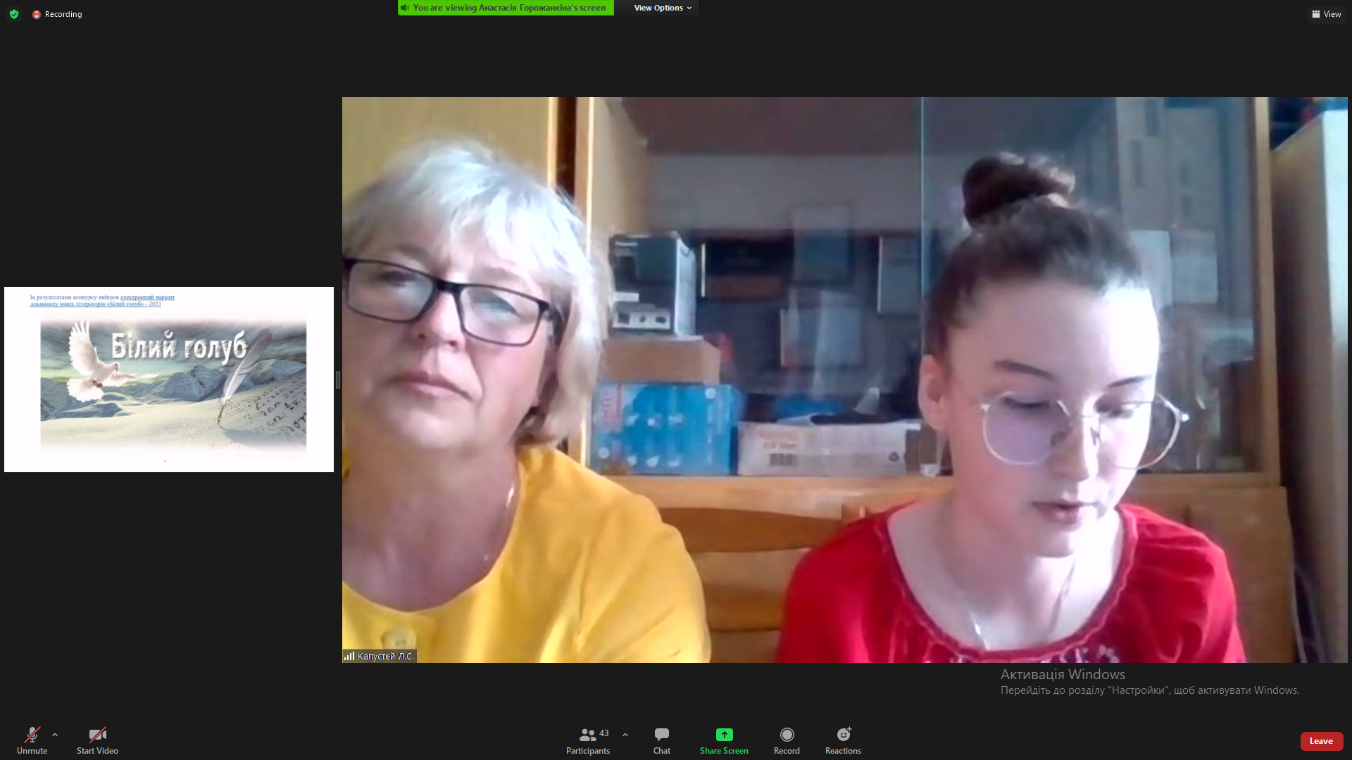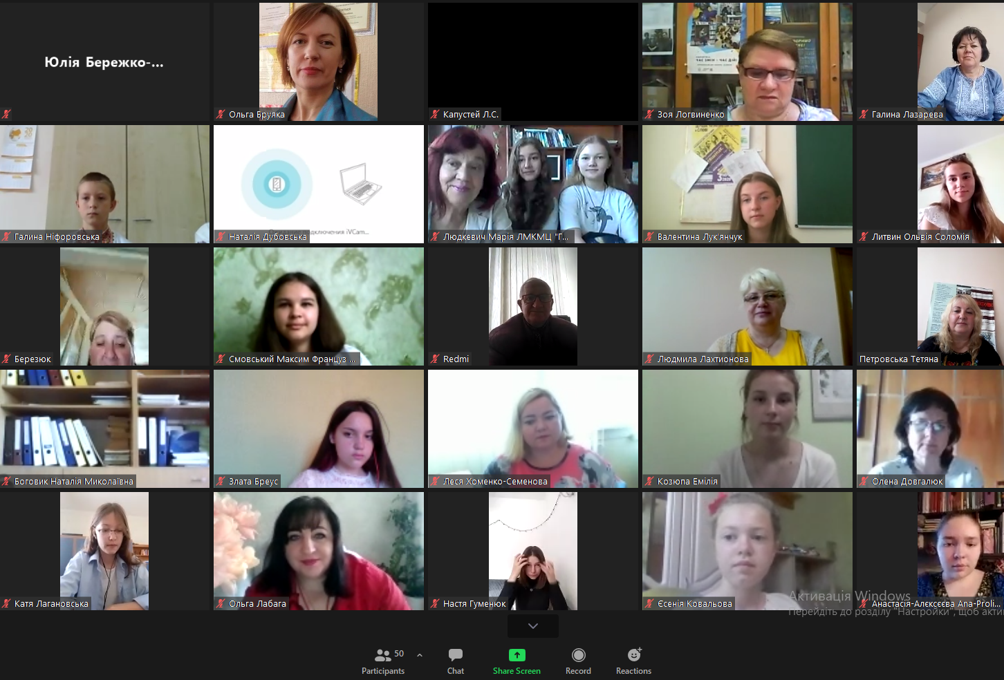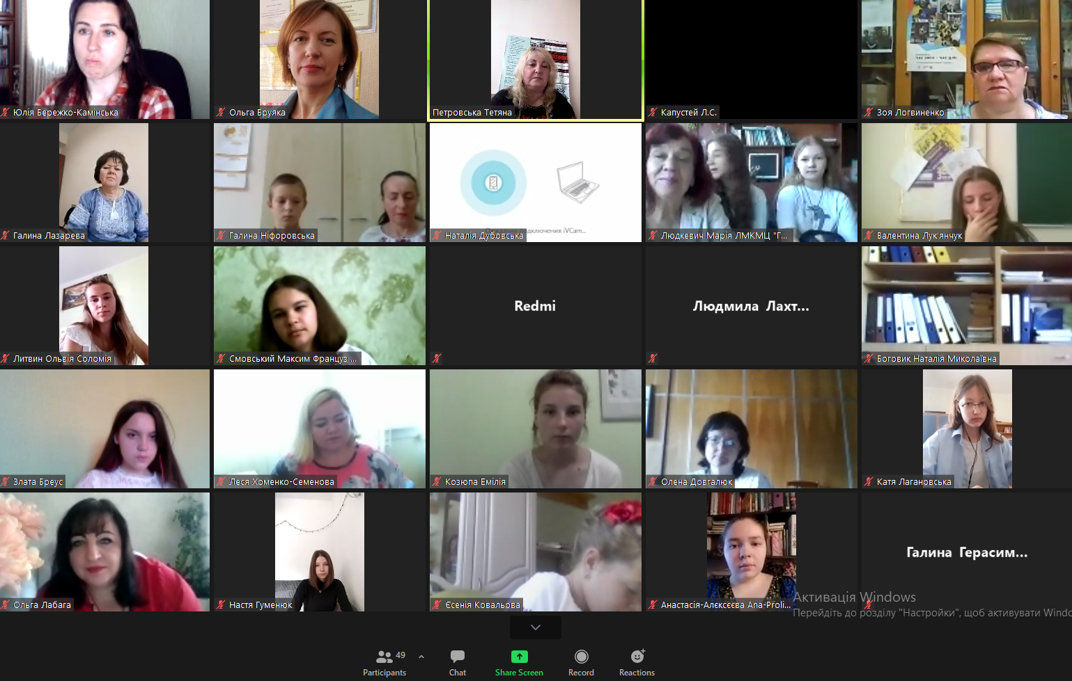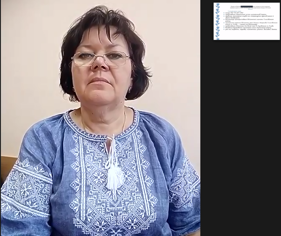Захоплено слухали учасники відеоконференції виступ Ю.М. Бережко-Камінської, секретаря Національної спілки письменників України по роботі з молоддю, письменницю і журналістку, переможця багатьох міжнародних та національних літературних конкурсів.