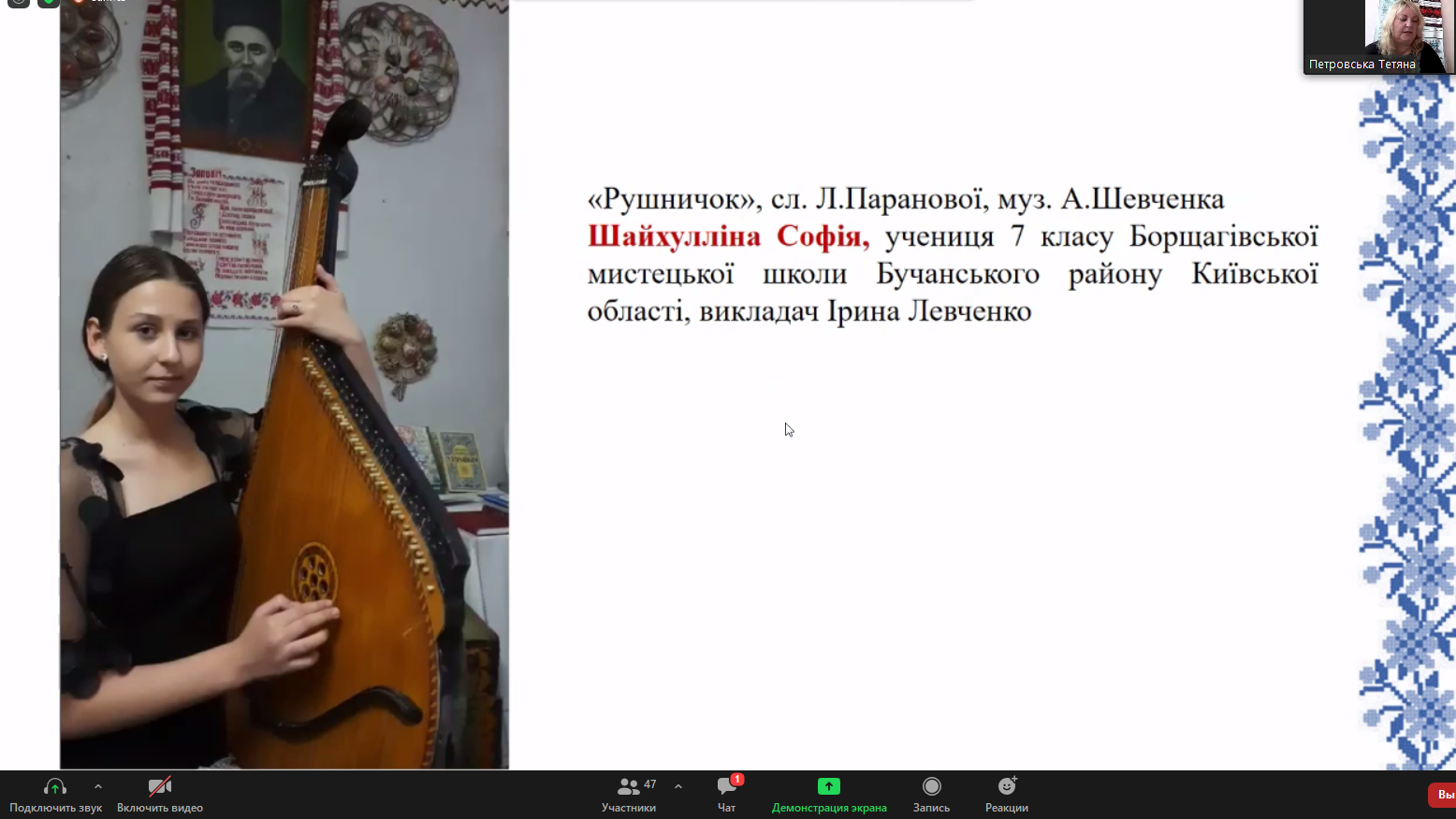 Окрасою літературно-мистецького свята стали музичні відеовиступи Борщагівської мистецької школи Бучанського району Київської області (директор М.О.Лук’яненко): Софії Шайхулліної і викладача Ірини Левченко (виконання на бандурі), Євдокії Капелюхи – лауреата обласних та Всеукраїнських конкурсів та Владислава Федорчука, лауреата міжнародних та Всеукраїнських конкурсів, вихованця дитячого хору «Сходинки» Софіївсько-Борщагівського НВК (керівник Ірина Якубовська, заслужений працівник культури України). Під час відеоконференції прозвучала пісня «Білий голуб» у виконанні Віктора Кавуна, заслуженого артиста України (сл. Т.Петровської, муз. Ю.Васильківського).