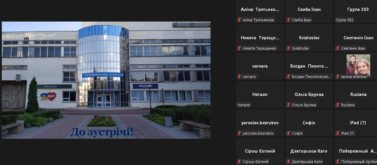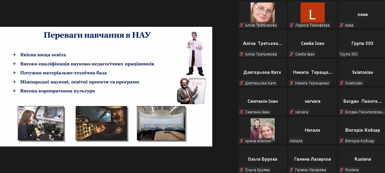 На онлайн-заході активно обговорювались питання щодо умов вступу; предметів, які вивчають студенти; освітніх можливостей університету, цікаве та активне студентське життя; участь студентів в олімпіадах та конкурсах; працевлаштування випускників; переваги університету та особливості навчання в НАУ. Захід пройшов у продуктивній атмосфері, щоб старшокласники визначилися зі вступом до закладу вищої освіти та обрали майбутню професію.