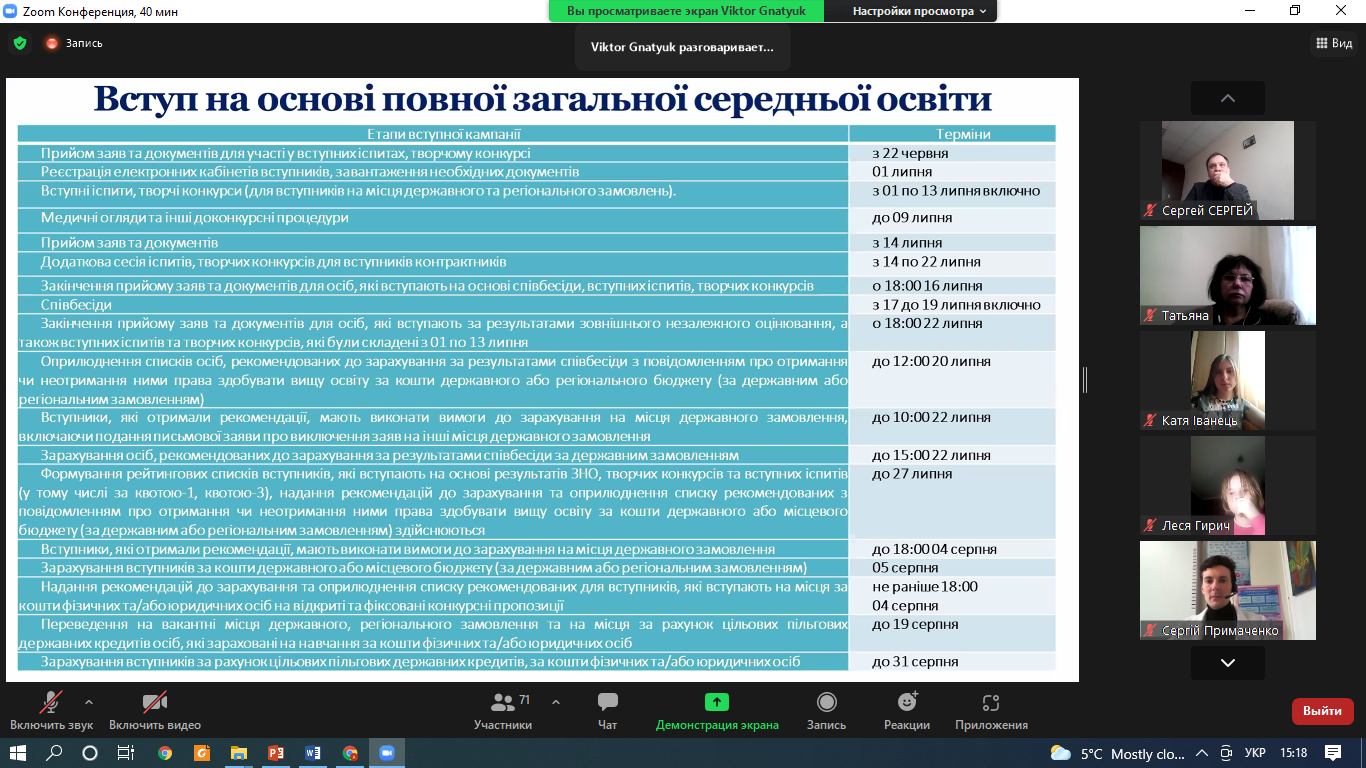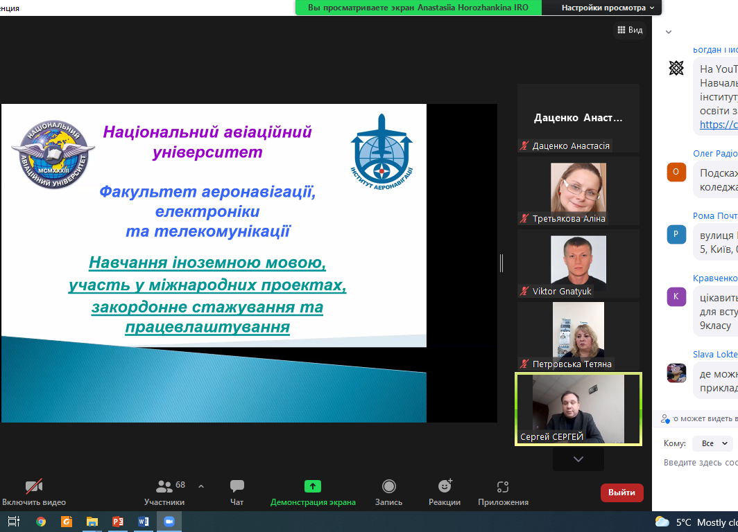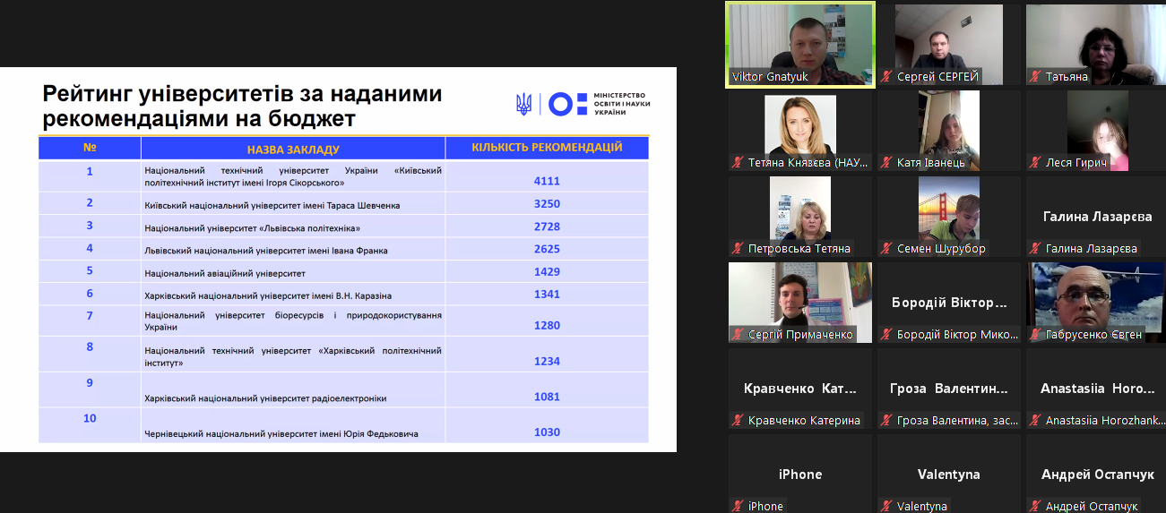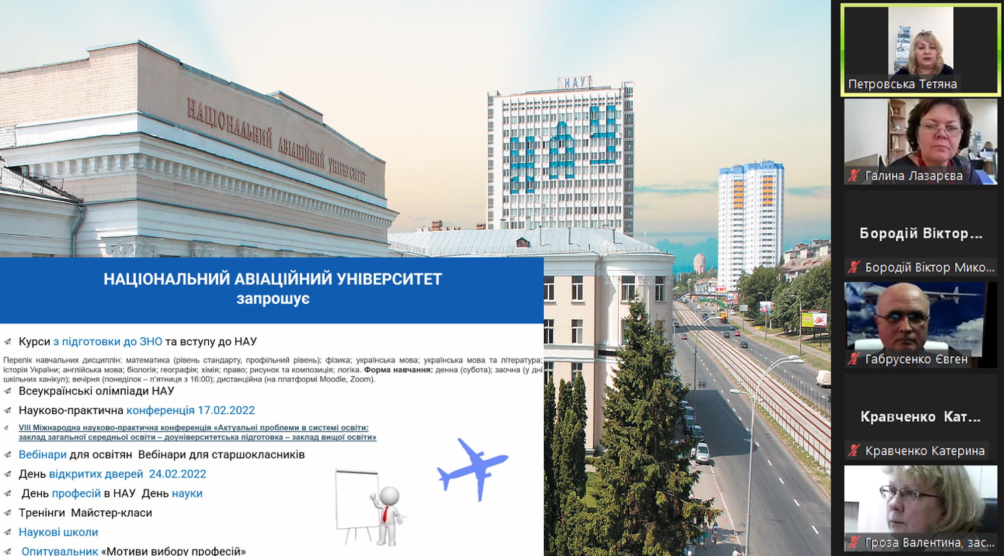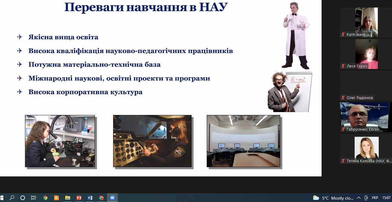 На онлайн-заході обговорювались питання щодо особливостей навчання в НАУ, умов вступу на різні спеціальності та факультети, професії, які опановують студенти, освітні напрямки, міжнародна співпраця, матеріально-технічне забезпечення, дозвілля та можливості для студентів, працевлаштування випускників тощо.