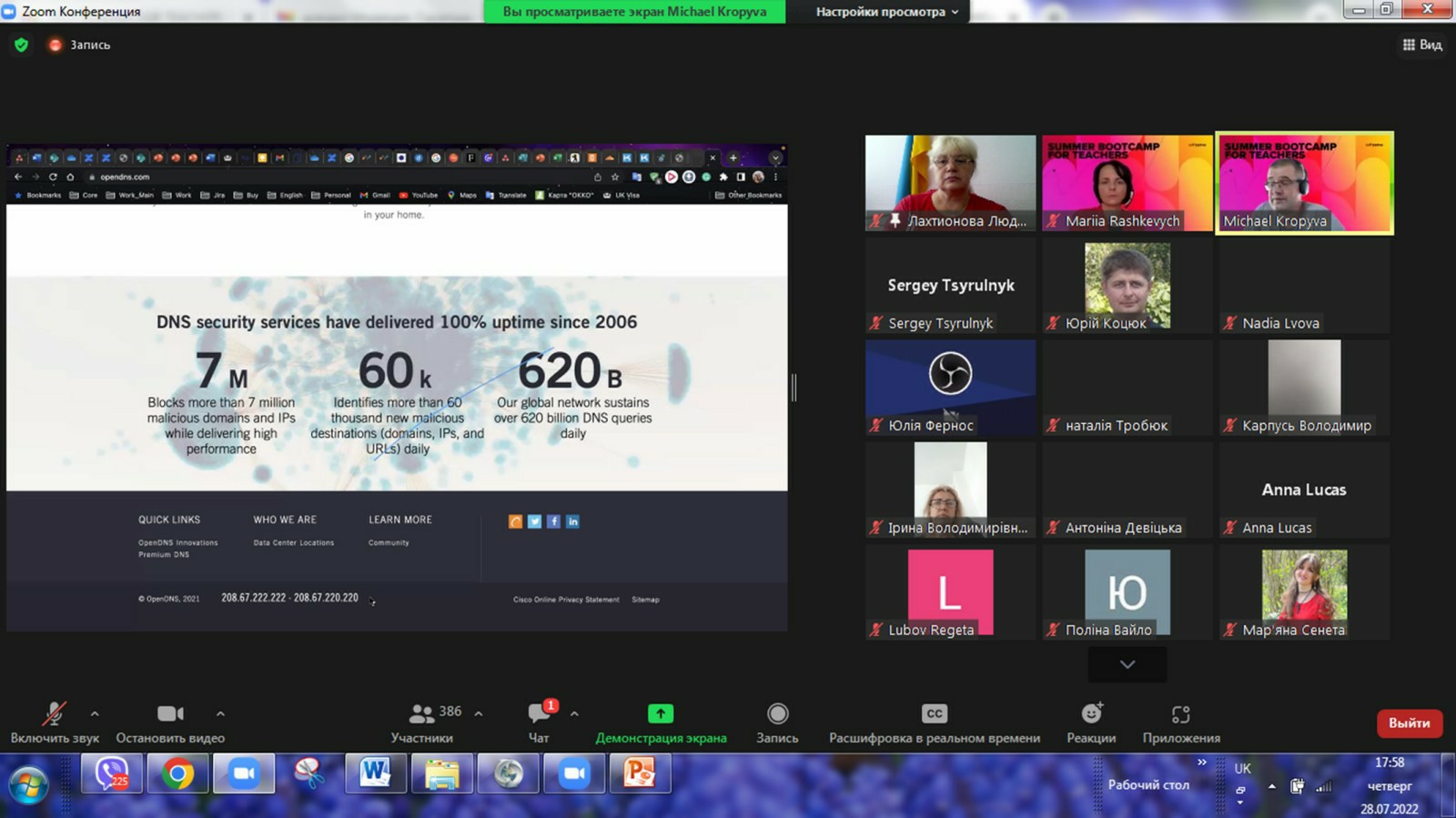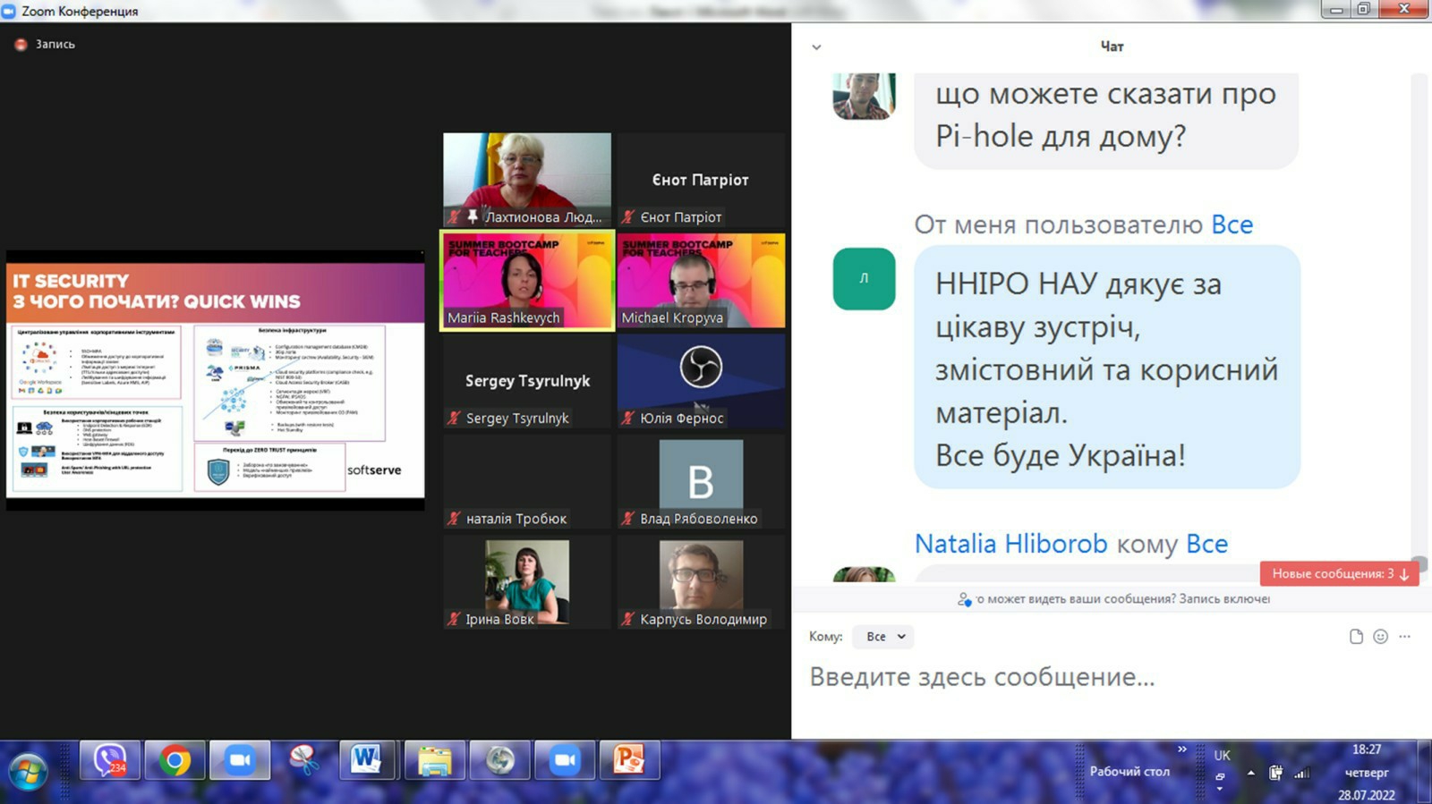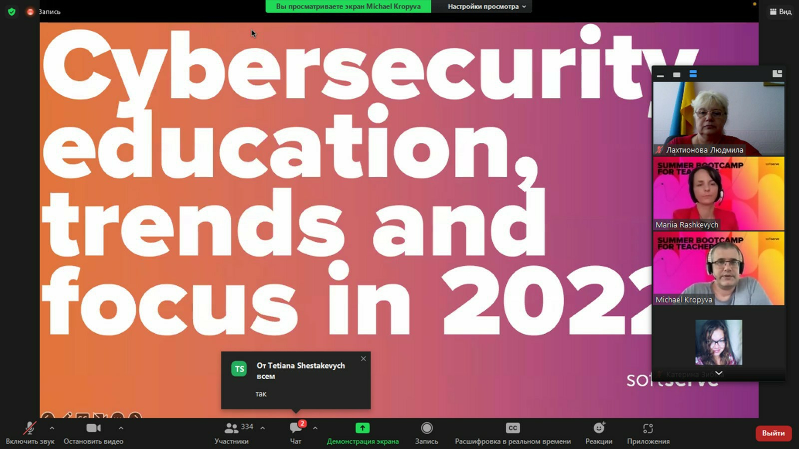 28 липня о 17.00 в режимі онлайн відбувся четвертий з циклу вебінар на найочікуванішу тему в рамках проєкту «Tech Summer for Teachers Bootcamp» - «Cybersecurity education - trends and focus 2022 / «Освіта з кібербезпеки – тенденції та фокус 2022».