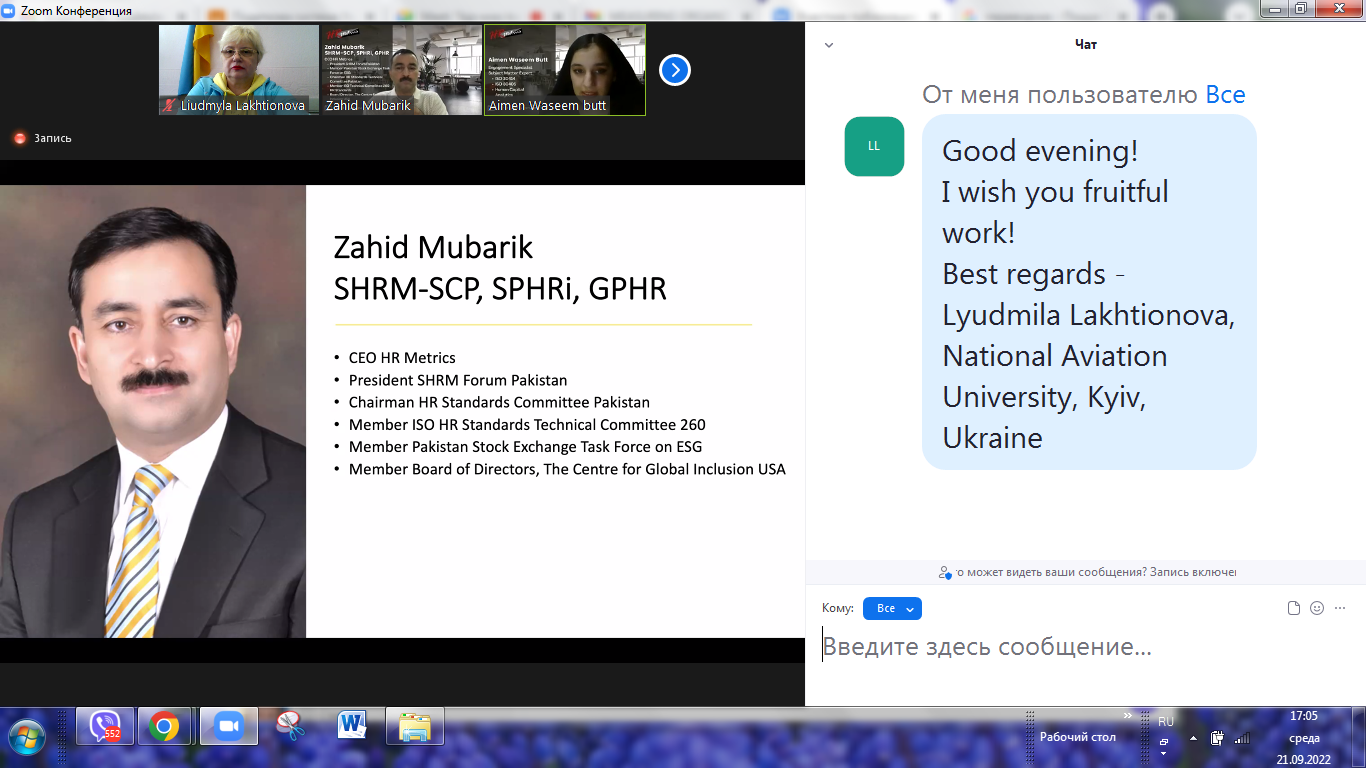 Спікер вебінару - Zahid MUBARIK, лідер стратегічного управління людськими ресурсами, генеральний директор HR Metrics, президент-засновник SHRM Forum Pakistan. Він має честь бути єдиним керівником відділу кадрів з Південної Азії, який став членом Технічного комітету 260 ISO з розробки глобальних стандартів управління персоналом.