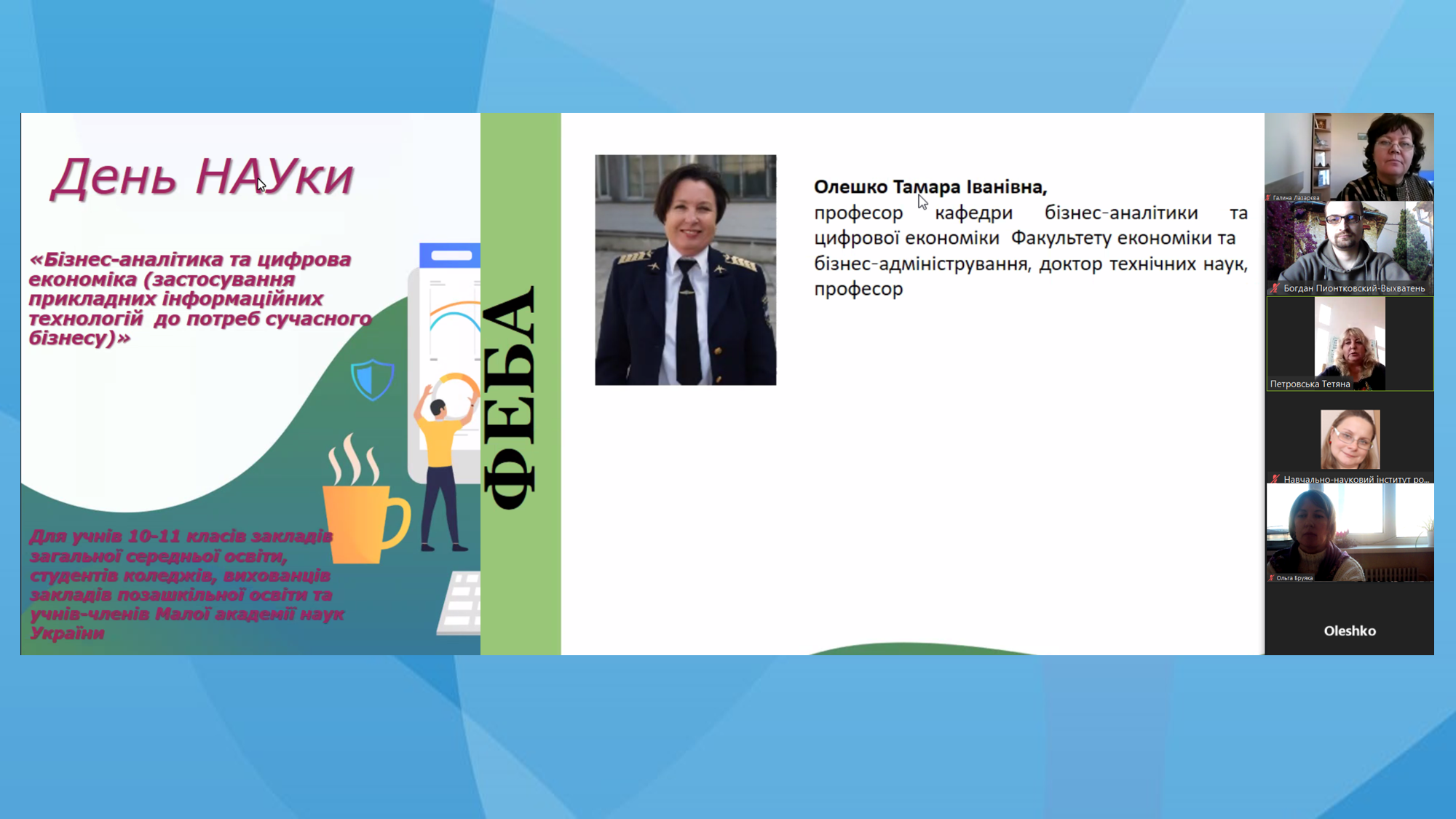 Лекція економіко-математичної наукової школи на тему: «Бізнес-аналітика та цифрова економіка (застосування прикладних інформаційних технологій до потреб сучасного бізнесу)» була надзвичайно інформативною для майбутніх абітурієнтів та всіх зацікавлених слухачів. Лектор – Олешко Тамара, професор кафедри бізнес-аналітики та цифрової економіки Факультету економіки та бізнес-адміністрування, доктор технічних наук, професор, структуровано пояснила, що бізнес-аналітика та цифрова економіка – це професії, які актуальні сьогодні і будуть актуальні через 10 і більше років, оскільки наступне десятиліття стане часом особливо інтенсивних змін у розвитку людського капіталу й технологій. Тамара Іванівна детально висвітлила переваги наступних ОПП: «Економічна кібернетика» (бізнес-аналітика), «Цифрова економіка», «Міжнародна економіка».