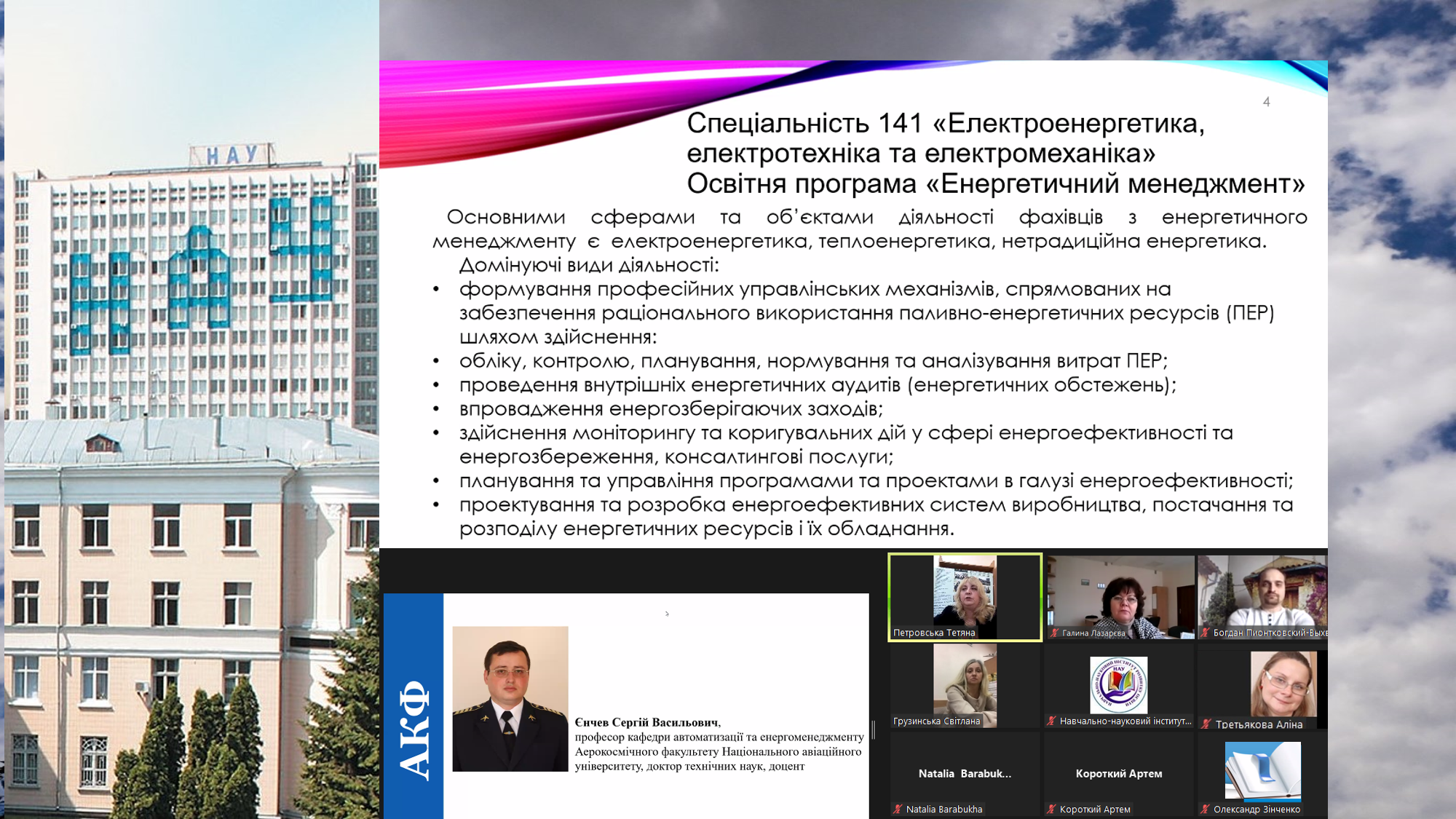 У заході взяли участь – Лазарєва Галина, директор Навчально-наукового інституту розвитку освіти НАУ, заслужений працівник освіти України; Єнчев Сергій, професор кафедри автоматизації та енергоменеджменту Аерокосмічного факультету Національного авіаційного університету, д.т.н., доцент; Кравчук Микола, доцент кафедри автоматизації та енергоменеджменту АКФ НАУ, к.тех.н., доцент; Єременко Роман, аспірант, асистент кафедри гідрогазових систем АКФ НАУ; Бєловол Віолетта, заступник директора з навчально-виховної роботи ВСП «Київський фаховий коледж комп’ютерних технологій та економіки Національного авіаційного університету»; Бруяка Ольга, завідувач кафедри базових та спеціальних дисциплін Навчально-наукового інституту розвитку освіти Національного авіаційного університету, к.т.н., доцент. Модератор заходу – Петровська Тетяна, к.пед.н., директор Центру допрофесійної підготовки та обдарованої учнівської молоді ННІРО НАУ.