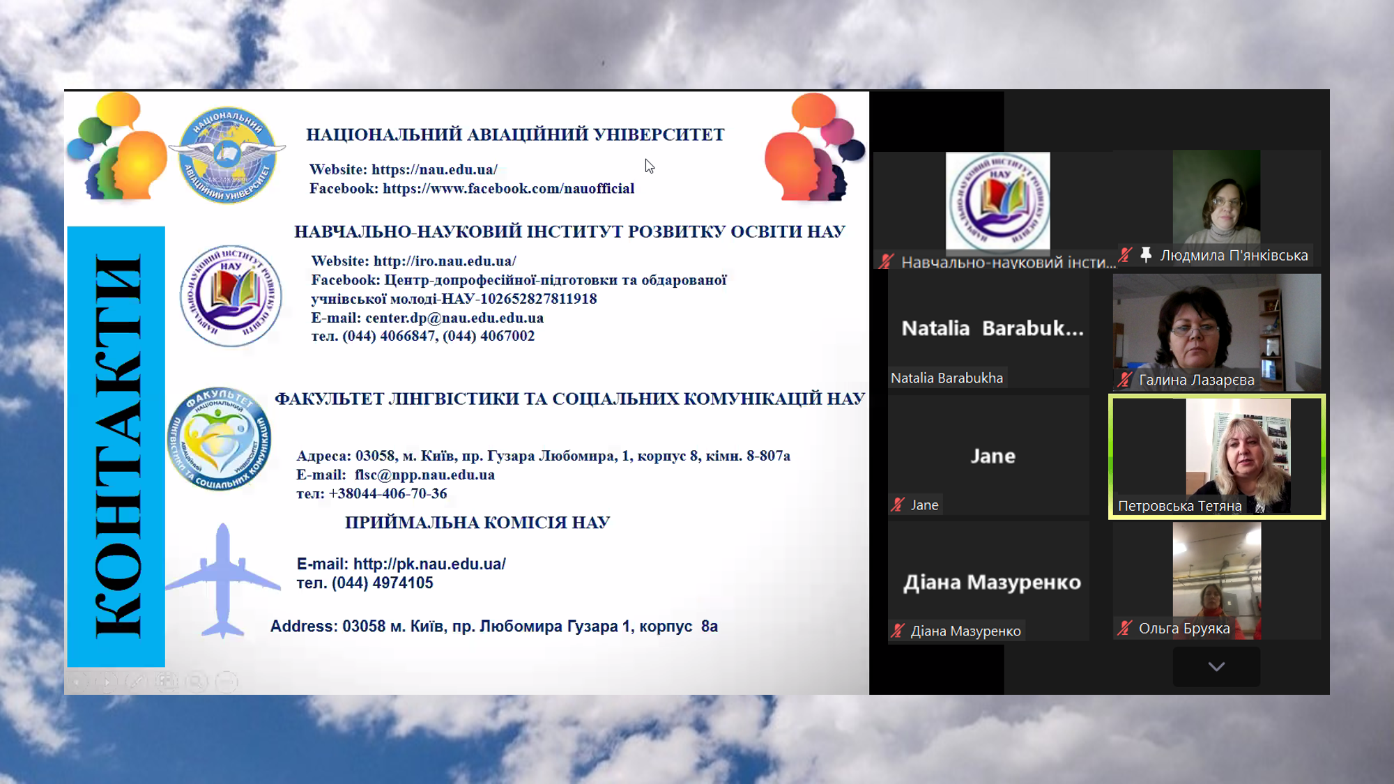 Модератор заходу – Петровська Тетяна, кандидат педагогічних наук, директор Центру допрофесійної підготовки та обдарованої учнівської молоді Навчально-наукового інституту розвитку освіти НАУ. Інформаційне забезпечення заходу здійснювала Третьякова Аліна, провідний фахівець ННІРО НАУ.