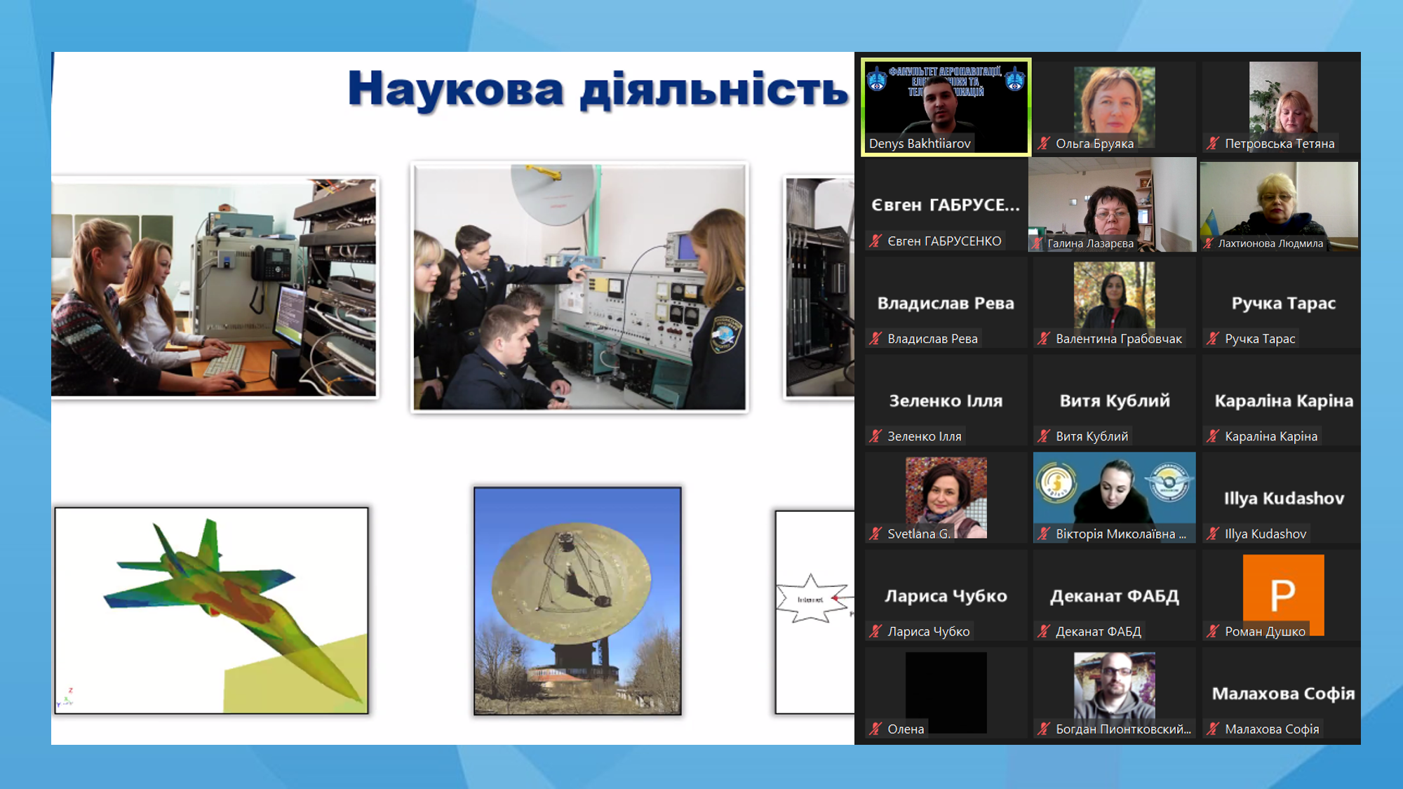 Спікери-науковці презентували факультети НАУ – Карпов Віктор, д.і.н., декан Факультету наземних споруд і аеродромів; Бородій Віктор, заступник декана Аерокосмічного факультету; Бахтіяров Денис, к.т.н., заступник декана Факультету аероновігації, електроніки та телекомунікацій; Габрусенко Євген, к.т.н., координатор профорієнтаційної роботи ФАЕТ, доцент; Гроза Валентина, к.ф-м.н., заступник декана Факультету екологічної безпеки, інженерії та технологій, доцент; Чубко Лариса, к.ф-м.н., доцент кафедри біотехнології ФЕБІТ, доцент; Марина Анна, к.е.н., доцент кафедри фінансів та оподаткування Факультету економіки та бізнес-адміністрування, доцент; Лазаренко Сергій, д.т.н., професор кафедри захисту засобів інформації Факультету кібербезпеки та програмної інженерії, професор.