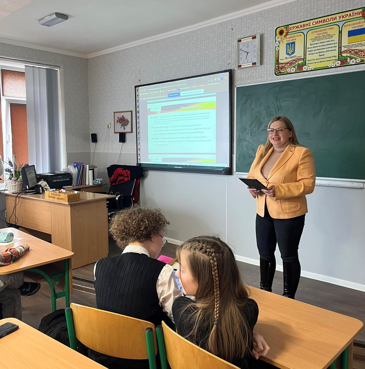 Доповідач– Штик Юлія В`ячеславівна, доцент, доцент кафедри економіки та бізнес-технологій Факультету економіки та бізнес адміністрування НАУ, кандидат економічних наук. За допомогою простих доступних прикладів з повсякденного життя та яскравої презентації Юлія В`ячеславівна розповіла учням про основи фінансової грамотності та про роль грошового обігу в суспільстві.