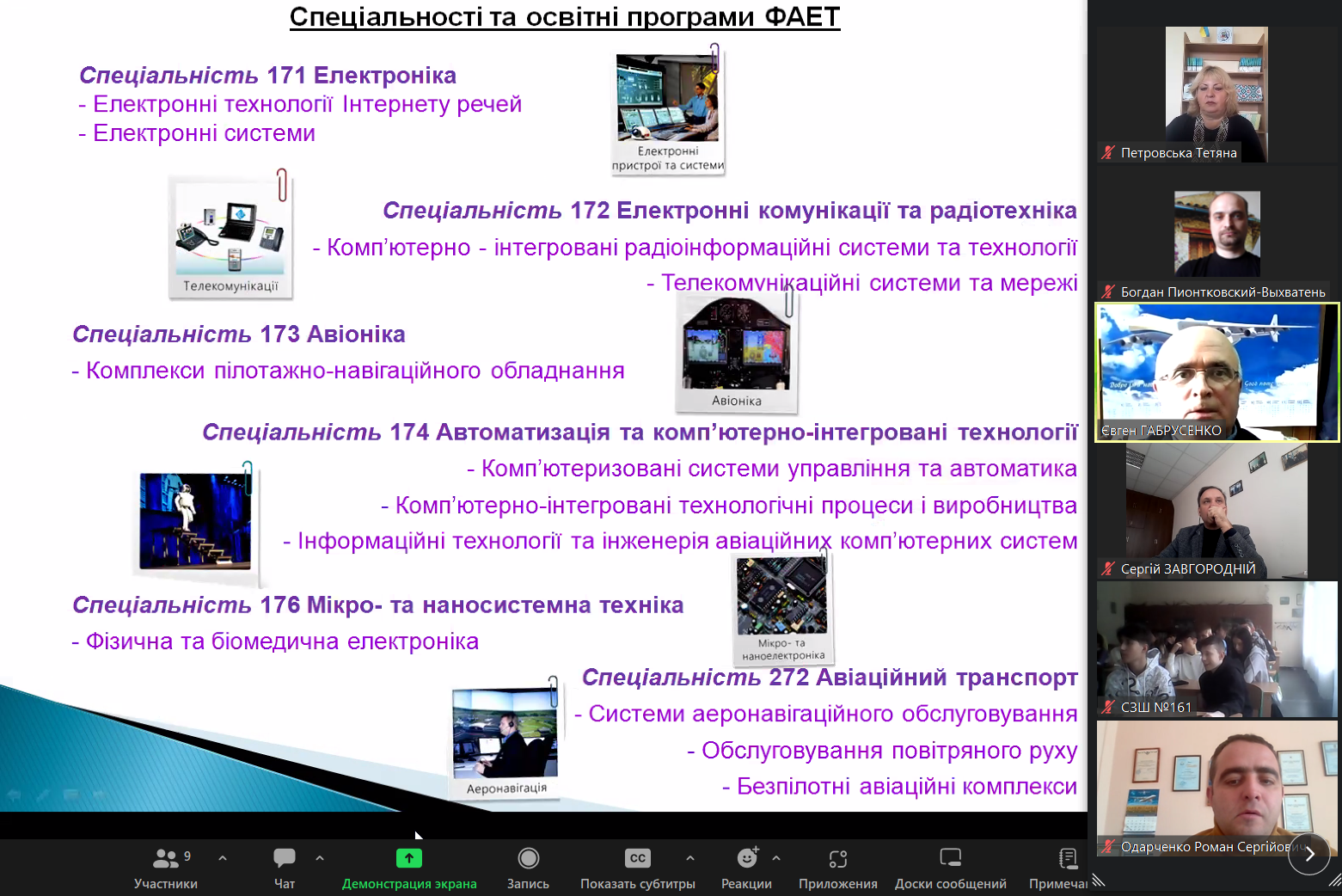 19 жовтня 2023 року відбувся профорієнтаційний захід «День професій» з ФАЕТ в онлайн-форматі для майбутніх абітурієнтів. Організатори заходу – Навчально-науковий інститут розвитку освіти (директор Лазарєва Галина, заслужений працівник освіти України) спільно з Факультетом Факультетом аеронавігації, електроніки та телекомунікацій.