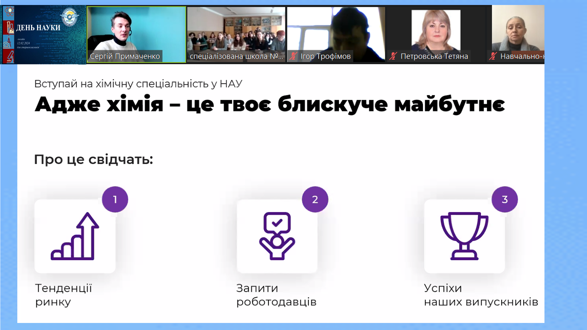 12 лютого 2024 року в Національному авіаційному університеті відбувся День науки для учнів закладів загальної середньої освіти з метою підвищення пізнавального інтересу до хімічної дисципліни.