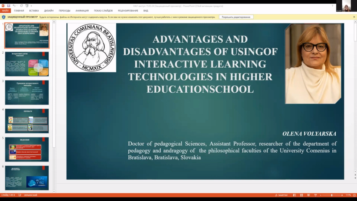 З темою «ПЕРЕВАГИ І НЕДОЛІКИ ЗАСТОСУВАННЯ ІНТЕРАКТИВНИХ ТЕХНОЛОГІЙ НАВЧАННЯ У ВИЩІЙ ШКОЛІ» виступила ВОЛЯРСЬКА О. С., д. пед. наук, доцент, кафедра педагогіки, Університет імені Я.-А. Коменського в Братиславі ( м. Братислава, Словацька республіка).