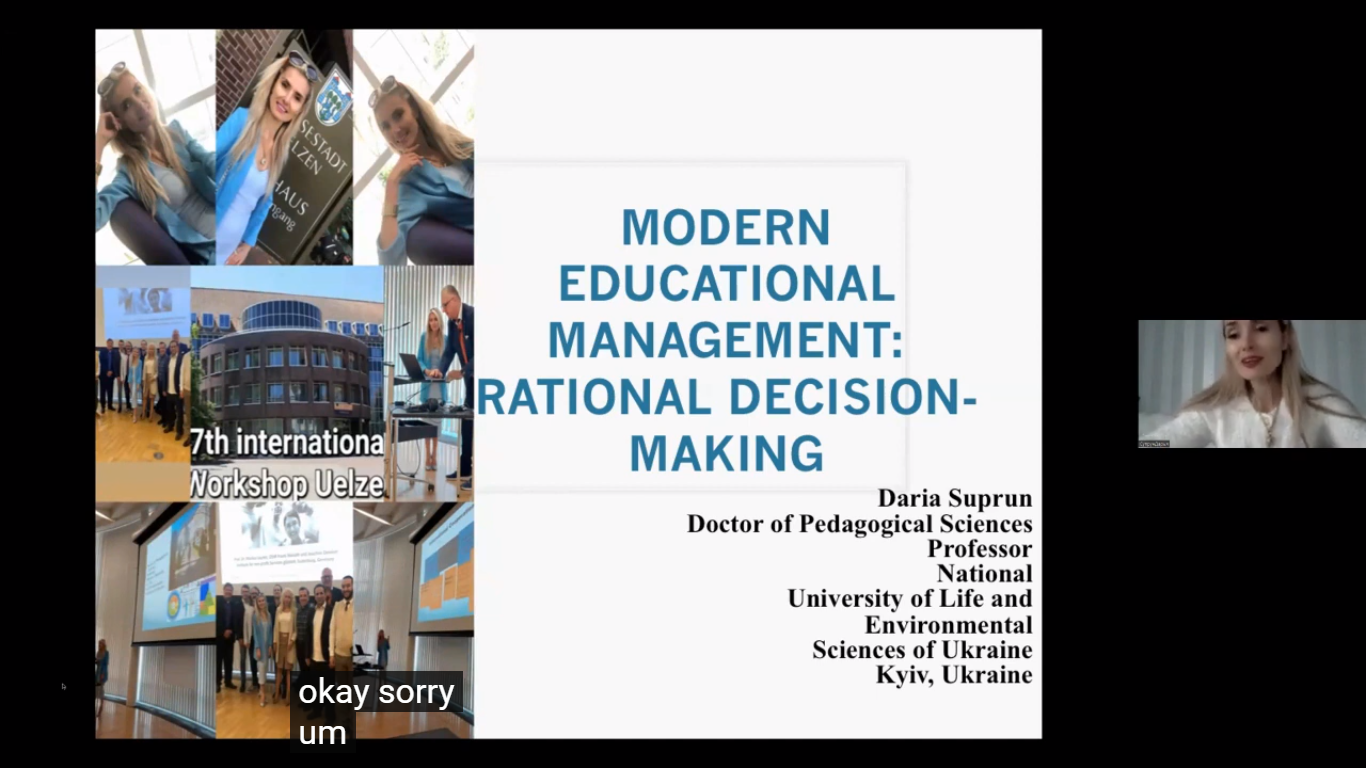 СУПРУН Д.М., д. пед. наук, професор кафедри соціальної роботи та реабілітації гуманітарно-педагогічного факультету Національного університету біоресурсів і природокористування України (м. Київ) розкрила сучасне управління освітою як раціональне прийняття рішень («MODERN EDUCATIONAL MANAGEMENT: RATIONAL DECISION-MAKING»).