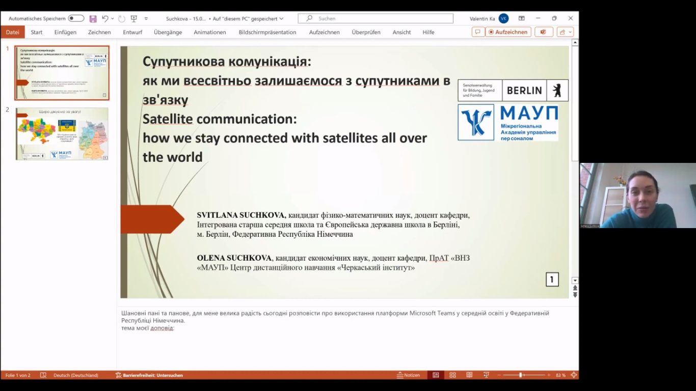 Особлива увага була прикута до виступу «СУПУТНИКОВИЙ ЗВ'ЯЗОК - ЯК МИ ЗАЛИШАЄМОСЯ НА ЗВ'ЯЗКУ ПО ВСЬОМУ СВІТУ ЗА ДОПОМОГОЮ СУПУТНИКІВ» СУЧКОВОЇ С., канд. фізико-матем. наук, доцента кафедри, Інтегрована старша середня школа та Європейська державна школа в Берліні (м. Берлін, Федеративна Республіка Німеччина) та СУЧКОВОЇ О.Д., канд. екон. наук, доцента, Представництво ПрАТ «Університет МАУП», Центр дистанційного навчання «Черкаський інститут» (м. Київ, Україна).