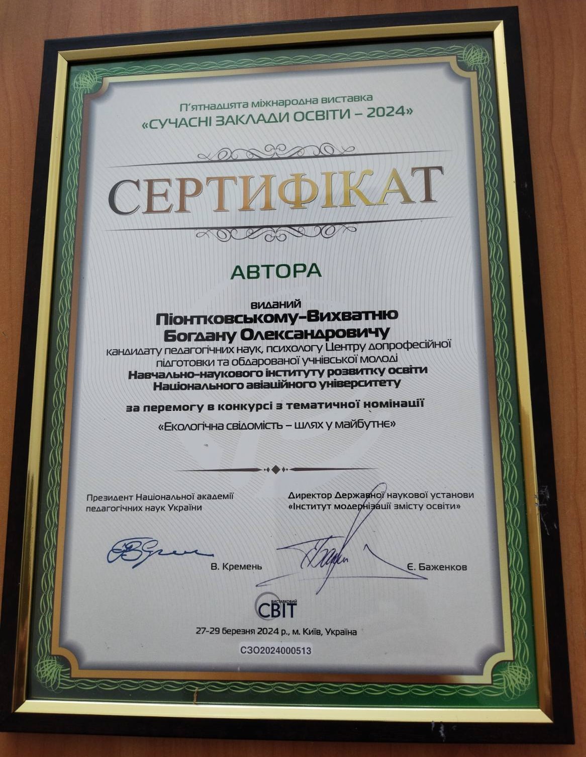 Інформаційні матеріали для участі НАУ у виставці підготувала Лазарєва Галина, директор Навчально-наукового інституту розвитку освіти НАУ, заслужений працівник освіти України. Автор конкурсної роботи з тематичної номінації – Піонтковський-Вихватень Богдан, к.пед.н., психолог Центру допрофесійної підготовки та обдарованої учнівської молоді ННІРО, відзначений сертифікатом за перемогу в конкурсі.