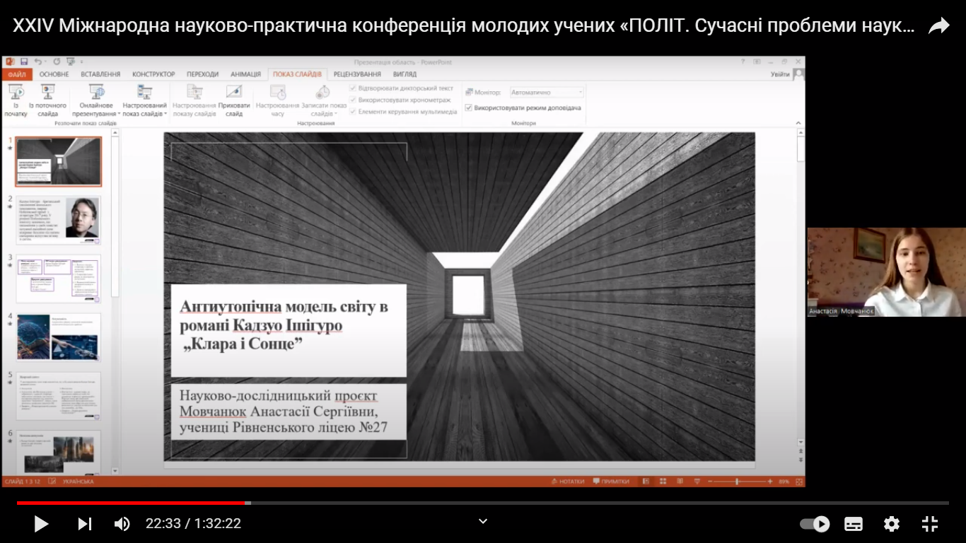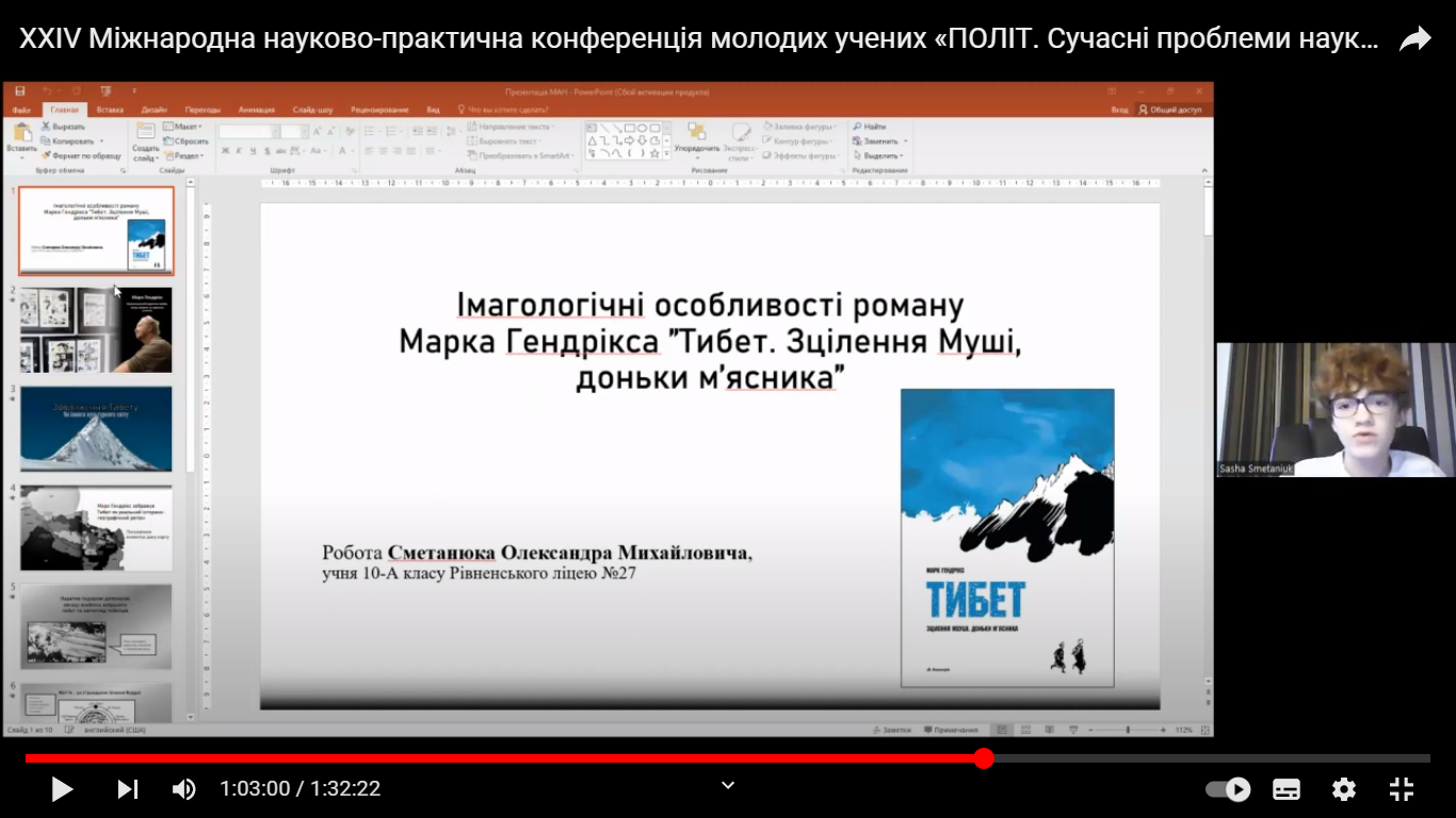 Велику зацікавленість викликали презентації «АНТИУТОПІЧНА МОДЕЛЬ СВІТУ В РОМАНІ КАДЗУО ІШІГУРО «КЛАРА І СОНЦЕ» МОВЧАНЮК АНАСТАСІЇ, учениці 9 класу, Рівненський ліцей № 27, та «ІМАГОЛОГІЧНИЙ ОБРАЗ ТИБЕТУ В РОМАНІ МАРКА ГЕНДРІКСА «ТИБЕТ. ЗЦІЛЕННЯ МУШІ, ДОНЬКИ М’ЯСНИКА» СМЕТАНЮКА ОЛЕКСАНДРА, Рівненська Мала академія наук учнівської молоді, м. Рівне. Наукові керівники: ВОРОБЙОВА Л.М., канд.. філолог. наук, доцент, керівник гуртка Рівненської малої академії наук учнівської молоді та ВОЗНЮК О.В., учитель-методист, Рівненський ліцей № 27, м. Рівне.