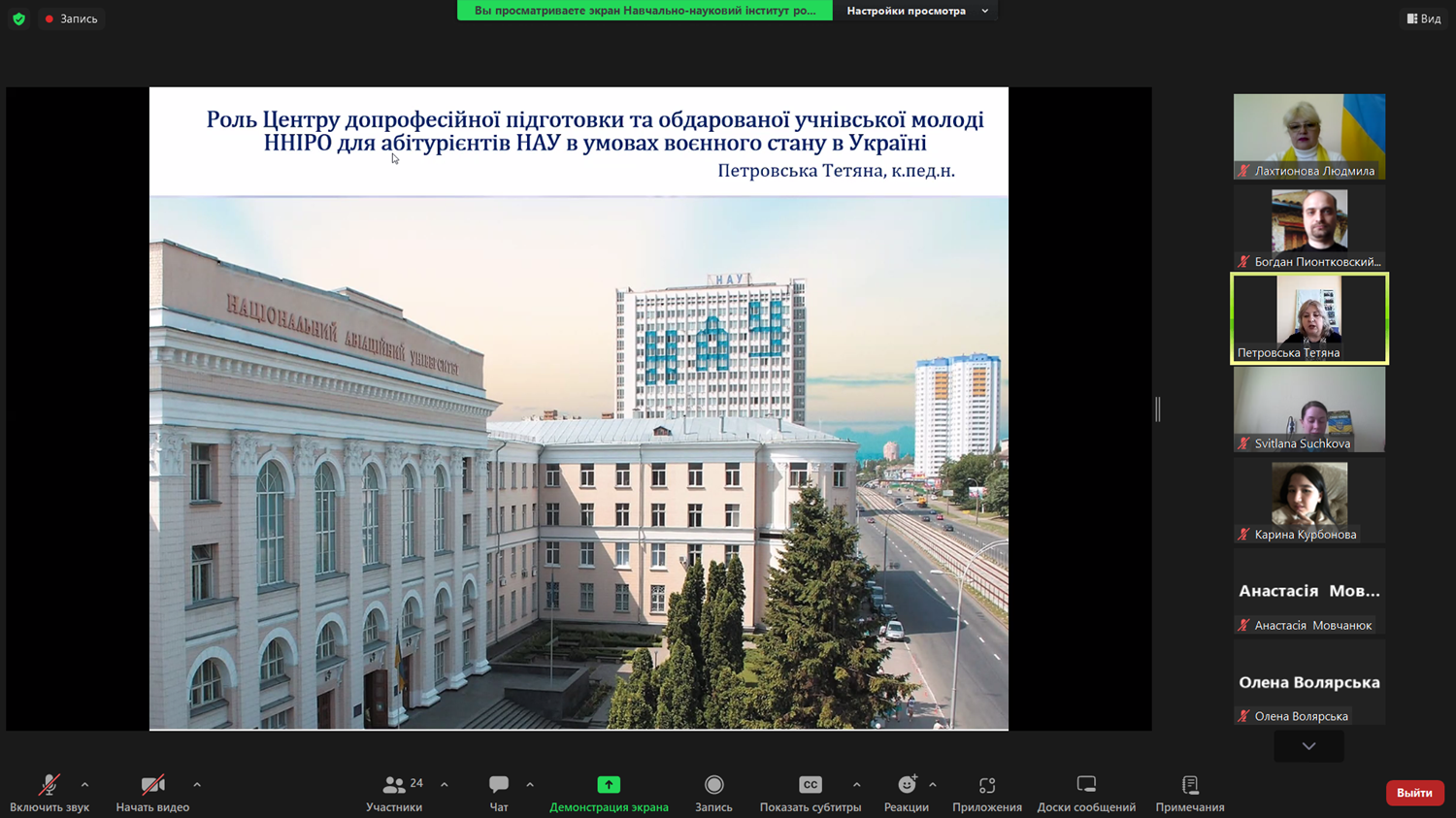 Розпочала роботу секції ПЕТРОВСЬКА Т.В., канд. пед. наук, директор Центру допрофесійної підготовки та обдарованої учнівської молоді, Навчально-науковий інститут розвитку освіти НАУ, доповіддю на тему «РОЛЬ ЦЕНТРУ ДОПРОФЕСІЙНОЇ ПІДГОТОВКИ ТА ОБДАРОВАНОЇ УЧНІВСЬКОЇ МОЛОДІ ННІРО ДЛЯ МАЙБУТНІХ АБІТУРІЄНТІВ НАУ В ПЕРІОД ВОЄННОГО СТАНУ В УКРАЇНІ».