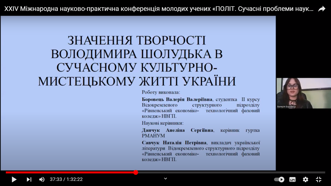 З м. Рівне виступила також БОРОВЕЦЬ ВАЛЕРІЯ, студентка 2 курсу Рівненського економіко-технологічного коледжу НУВГП з темою «ЗНАЧЕННЯ ТВОРЧОСТІ ВОЛОДИМИРА ШОЛУДЬКА В СУЧАСНОМУ ІСТОРИКО - КУЛЬТУРНОМУ ЖИТТІ УКРАЇНИ». Науковий керівник: САВЧУК Н.П, викладач української мови та літератури, викладач-методист ВСП «Рівненський економіко-технологічний фаховий коледж НУВГП», м. Рівне, Україна