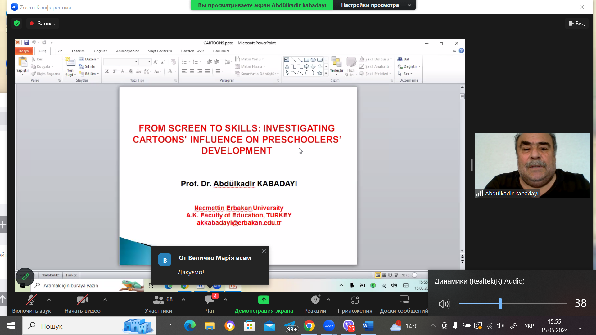 Тему «ВІД ЕКРАНУ ДО НАВИЧОК: ДОСЛІДЖЕННЯ ВПЛИВУ МУЛЬТФІЛЬМІВ НА РОЗВИТОК ДОШКІЛЬНИКІВ» висвітлив АБДУЛКАДИР КАБАДАЙІ, канд. пед. наук, професор, академік, педагогічний факультет, Університет імені Неджметтіна Ербакана (м. Конья, Туреччина).