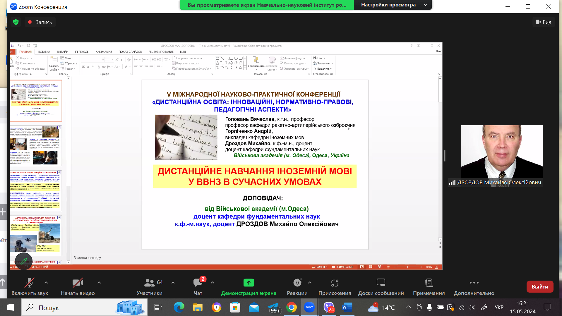Вельми актуальною та цікавою була презентація «ДИСТАНЦІЙНЕ НАВЧАННЯ ІНОЗЕМНІЙ МОВІ У ВВНЗ В СУЧАСНИХ УМОВАХ» ДРОЗДОВА М.О., канд. фіз.-мат. наук, доцент, кафедра фундаментальних наук, Військова академія (м. Одеса, Україна). Співавтори: ГОЛОВАНЬ В.Г., канд. тех. наук, професор, кафедра ракетно-артилерійського озброєння та ГОРЛІЧЕНКО А.М., викладач кафедри іноземних мов, Військова академія (м. Одеса, Україна).