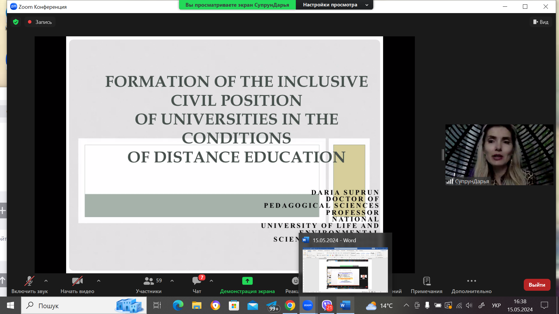 Про формування інклюзивної громадянської позиції університетів в умовах дистанційної форми навчання («FORMATION OF THE INCLUSIVE CIVIL POSITION OF UNIVERSITIES IN THE CONDITIONS OF DISTANCE EDUCATION») доповіла СУПРУН Д.М., д. пед. наук, професор, кафедра соціальної роботи та реабілітації, гуманітарно-педагогічного факультет, Національний університет біоресурсів і природокористування України (м. Київ, Україна).