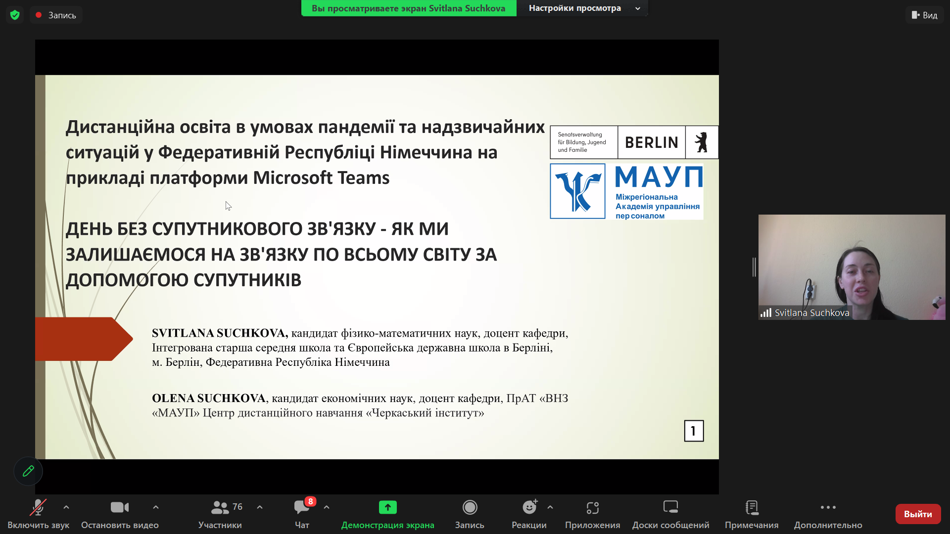 З темою «ДЕНЬ БЕЗ СУПУТНИКОВОГО ЗВ'ЯЗКУ - ЯК МИ ЗАЛИШАЄМОСЯ НА ЗВ'ЯЗКУ ПО ВСЬОМУ СВІТУ ЗА ДОПОМОГОЮ СУПУТНИКІВ» виступила СВІТЛАНА СУЧКОВА, канд. фіз.-мат. наук, доцент кафедри, Інтегрована старша середня школа та Європейська державна школа в Берліні (м. Берлін, Федеративна Республіка Німеччина), запропонувала німецькі безкоштовні програми для використання супутникового зв’язку в українському освітньому процесі. Співатор доповіді – ОЛЕНА СУЧКОВА, канд. екон. наук, доцент, представництво ПрАТ «Університет МАУП», Центр дистанційного навчання «Черкаський інститут», м. Чекаси, Україна.