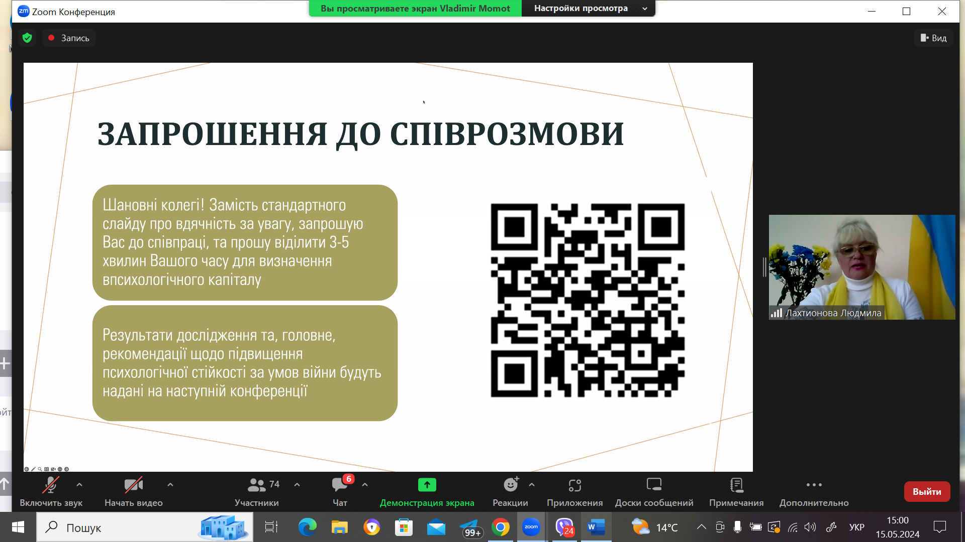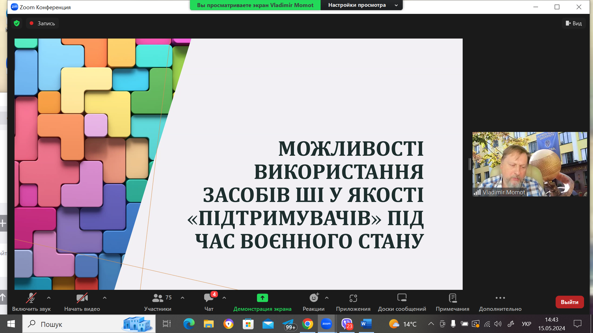 Велику зацікавленість викликала презентація «ОСОБЛИВОСТІ ТА МОЖЛИВОСТІ СПРИЙНЯТТЯ ШІ У ЯКОСТІ ПІДТРИМУВАЧА ПІД ЧАС ВОЄННОГО СТАНУ» МОМОТА В.Є., д. екон. наук, професора кафедри інноваційного менеджменту та фінансової аналітики, Університет імені Альфреда Нобеля (м. Дніпро, Україна). Доповідачем було запропоновано відповісти на запитання тематичного авторського опитувальника з метою подальшого опрацювання відповідей та доведенням отриманих результатів на наступній конференції.