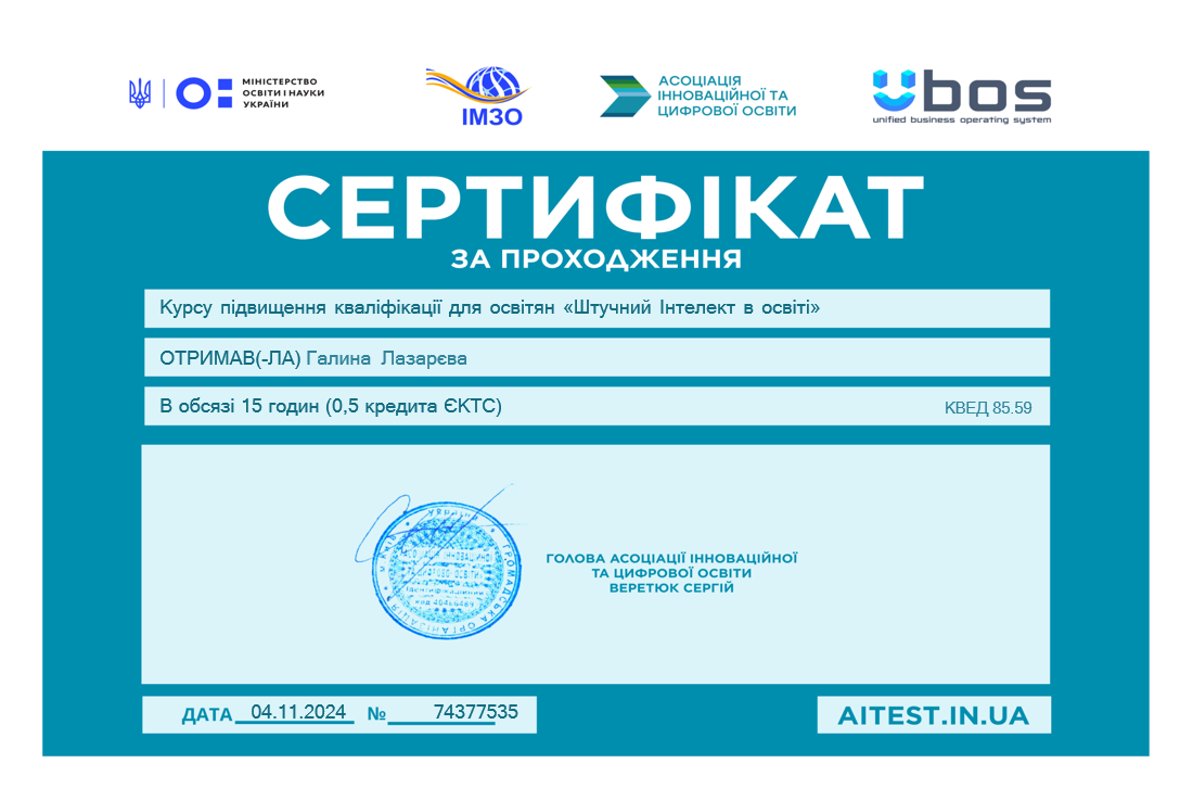 Директор Навчально-наукового інституту розвитку освіти Галина Лазарєва в жовтні 2024 року успішно завершила курс підвищення кваліфікації для освітян «Штучний інтелект в освіті», організований Асоціацією інноваційної та цифрової освіти.