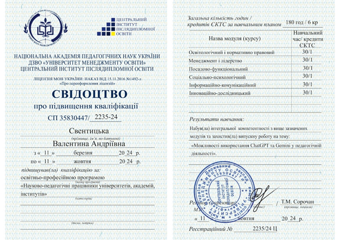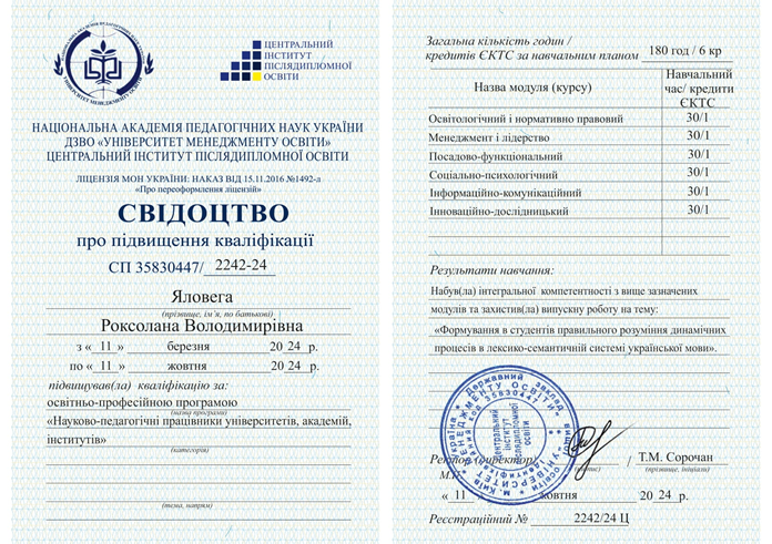 Старші викладачі кафедри базових та спеціальних дисциплін Навчально-наукового інституту розвитку освіти: Свентицька Валентина, Яловега Роксолана з 11 березня по 11 жовтня 2024 року успішно пройшли курс підвищення кваліфікації у Центральному інституті післядипломної освіти ДЗВО «Університет менеджменту освіти» НАПН України.