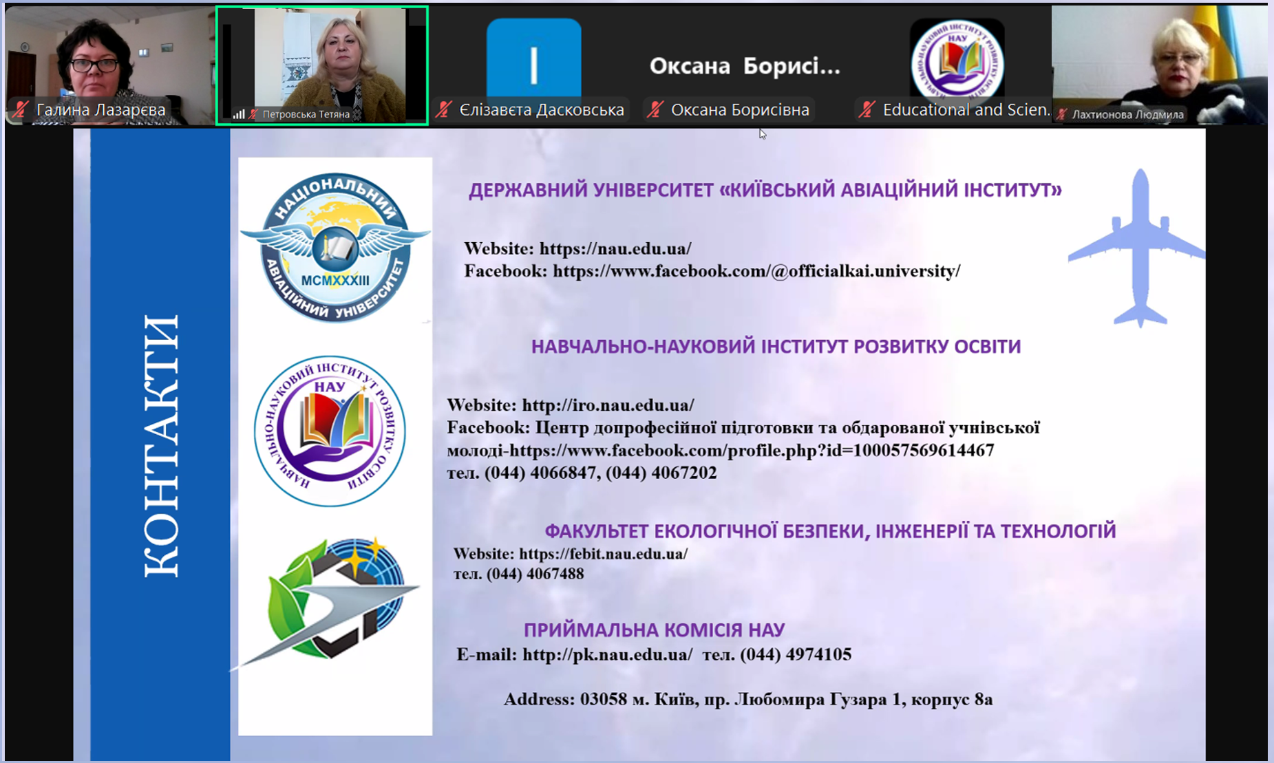 Організатори дистанційного заходу – Навчально-науковий інститут розвитку освіти, який очолює Галина ЛАЗАРЄВА, заслужений працівник освіти України, спільно з Факультетом екологічної безпеки, інженерії та технології КАІ, в.о. декана Сергій ЗОЗУЛЯ, к.т.н.
