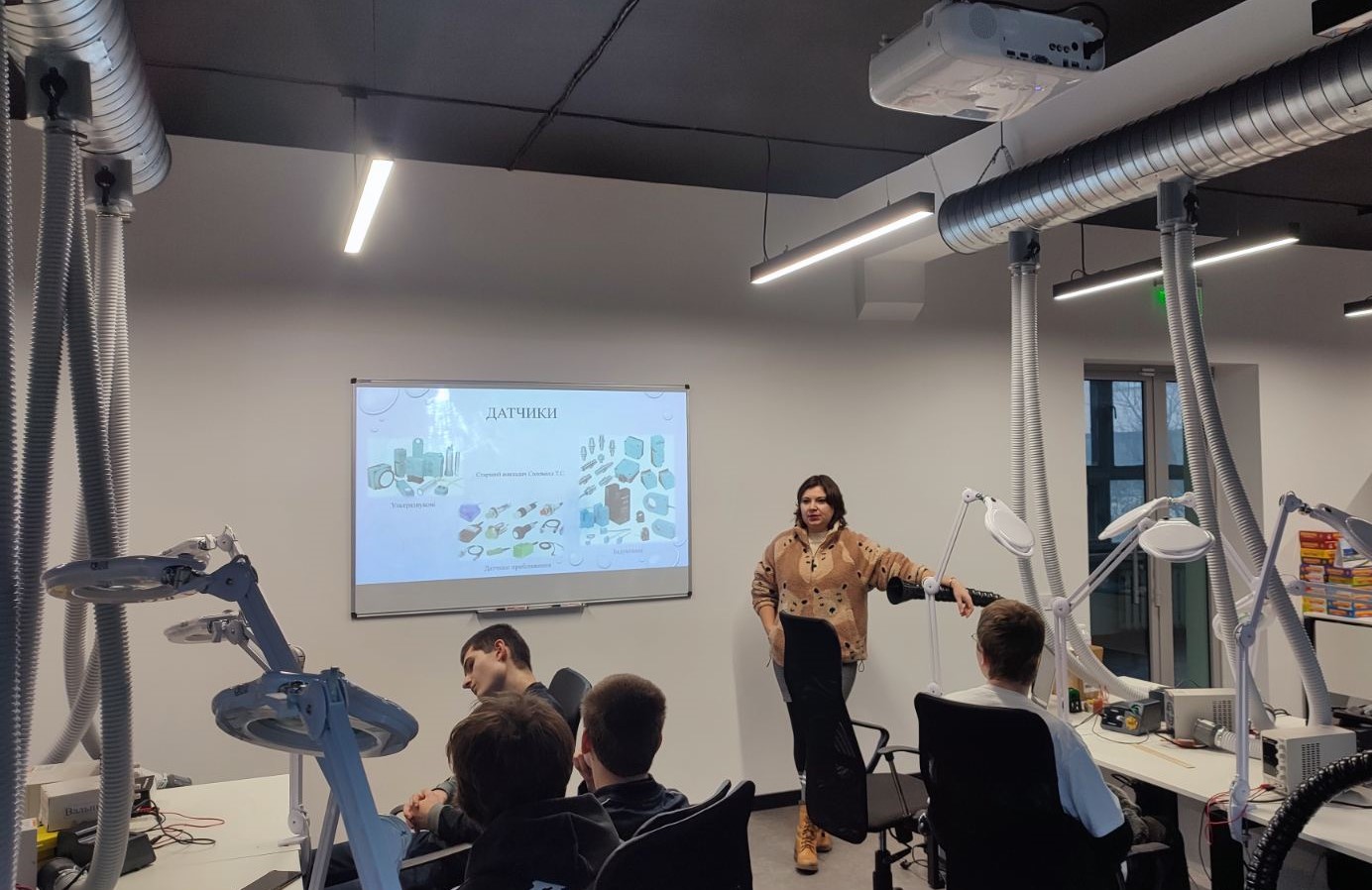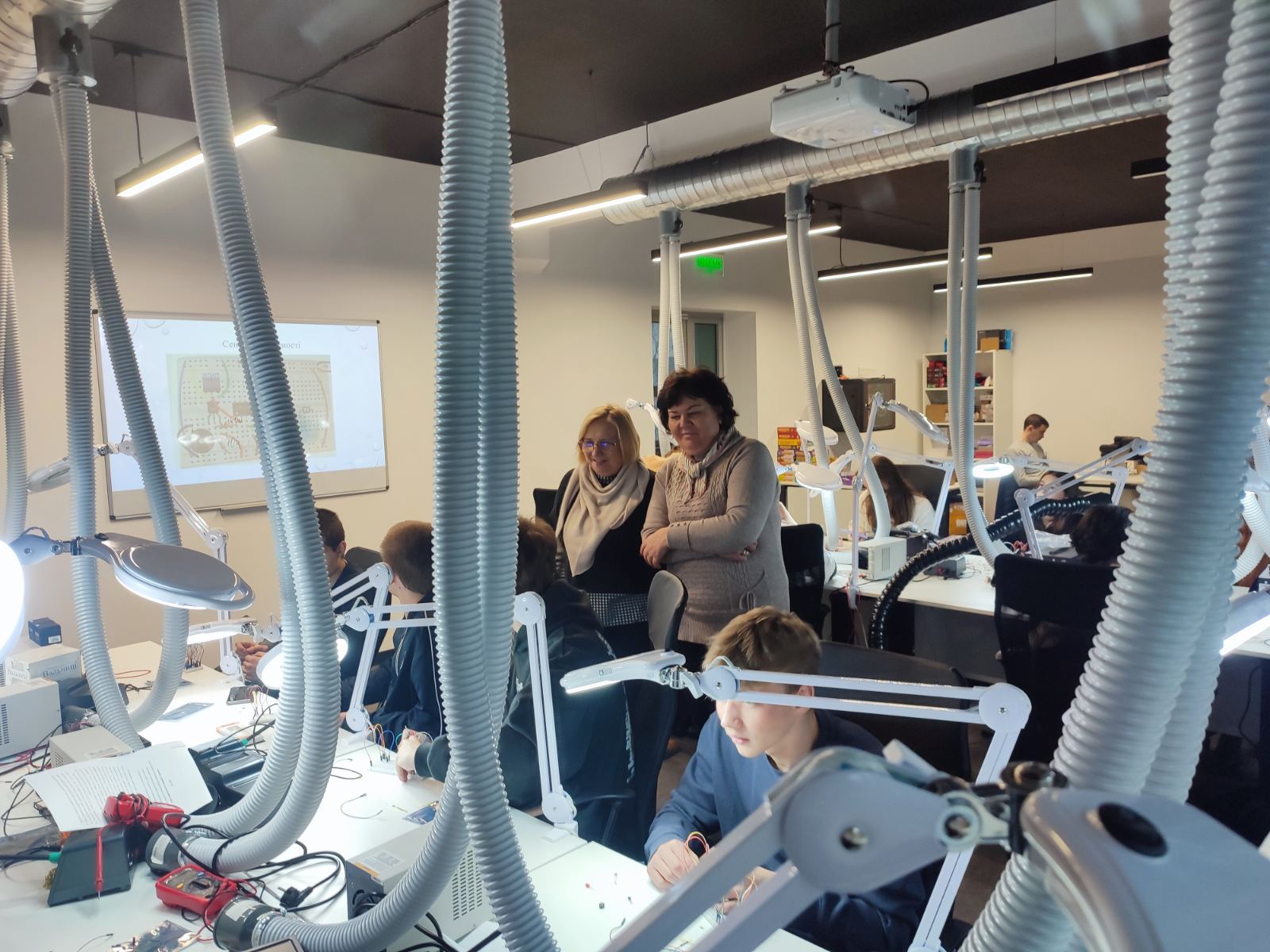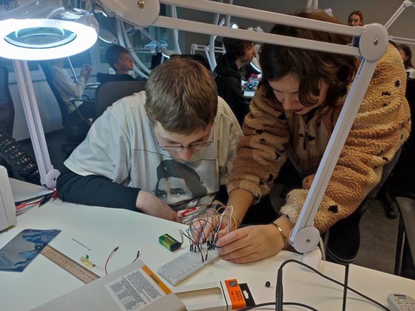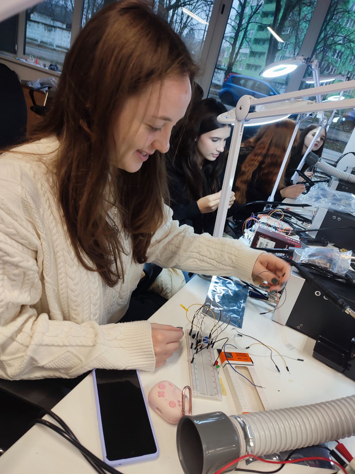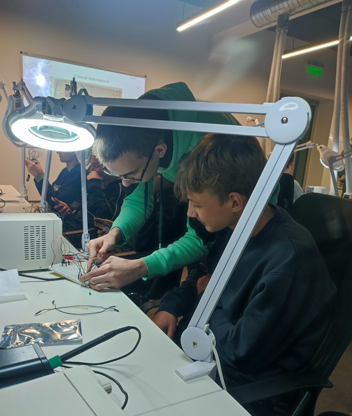 Під час заходу ознайомитися зі спеціальностями, пов’язаними із електронікою, телекомунікаціями, авіонікою та інтернетом речей, які здобувають студенти ФАЕТ, та на сучасному обладнанні відпрацювати практичну частину – створити власний проєкт «Сенсор освітленості» учням 10 класу технологічного профілю Ліцею № 144 ім. Г. Ващенка м. Києва (директор Шпильова Вікторія) допомагали Тетяна Соломаха, старший викладач кафедри авіоніки та систем управління; студенти 1-2 курсу ФАЕТ.