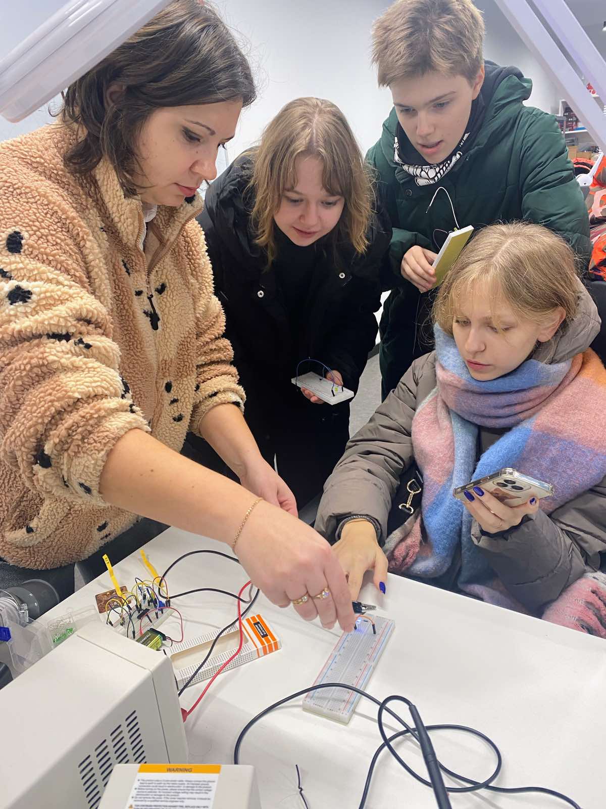 Учні вивчали паралельне з’єднання світлодіодів, аналізуючи, як це впливає на загальний струм в ланцюзі. Ці експерименти надали учням базові знання, які є необхідними для подальшого вивчення електроніки. Заходи в лабораторії стали гарною можливістю для молоді поглибити свої знання та отримати практичний досвід у сфері електроніки, що сприяє розвитку їхнього інтересу до технічних наук.