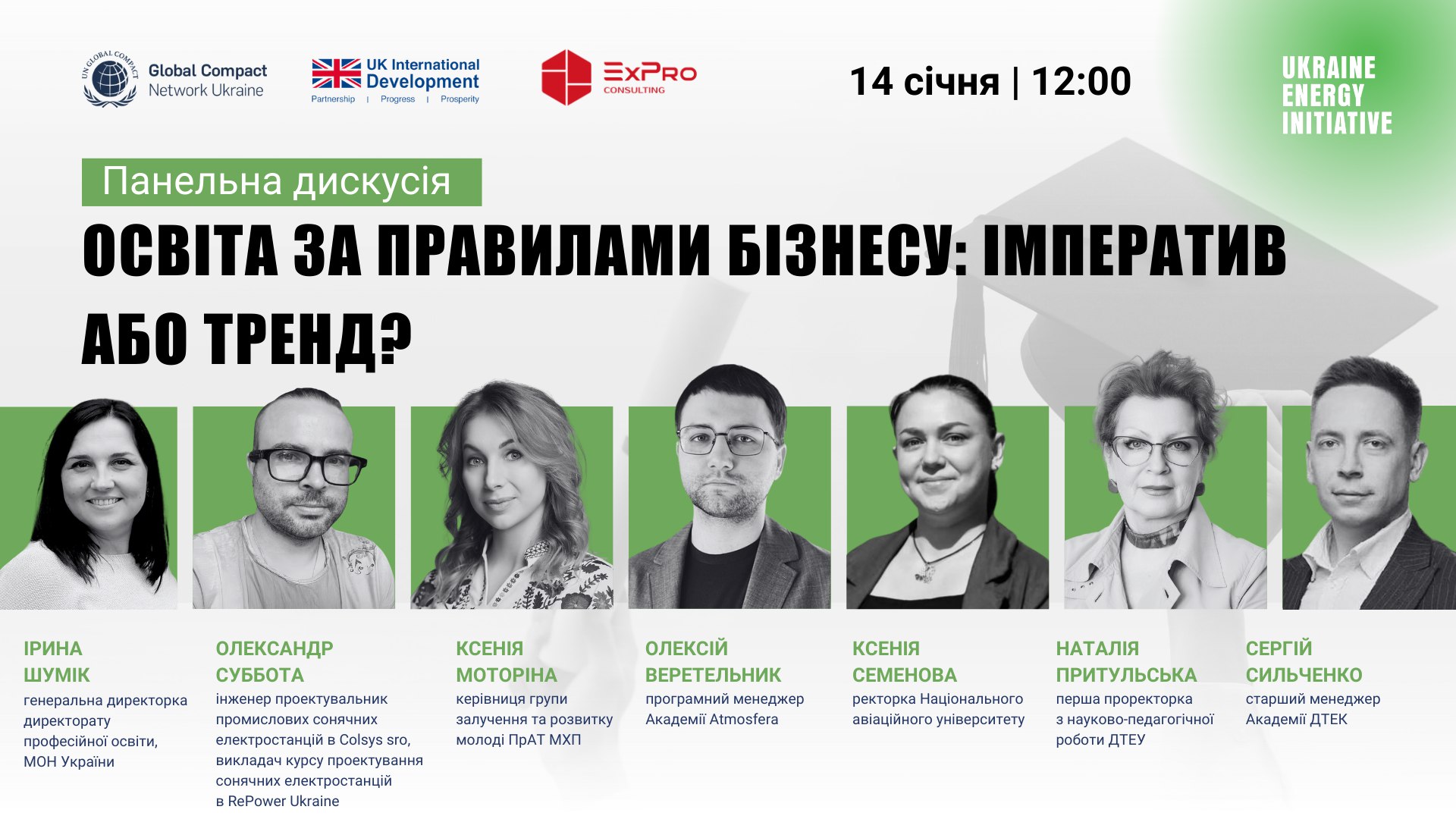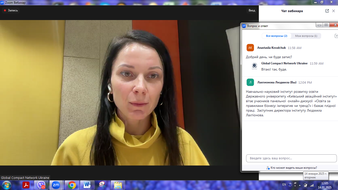 14 січня 2025 року відбулась онлайн-дискусія «Освіта за правилами бізнесу: імператив чи тренд?», яку організував Глобальний договір ООН в Україні в межах Ukraine Energy Initiative, до якої долучилась заступниця директора ННІРО Людмила ЛАХТІОНОВА .