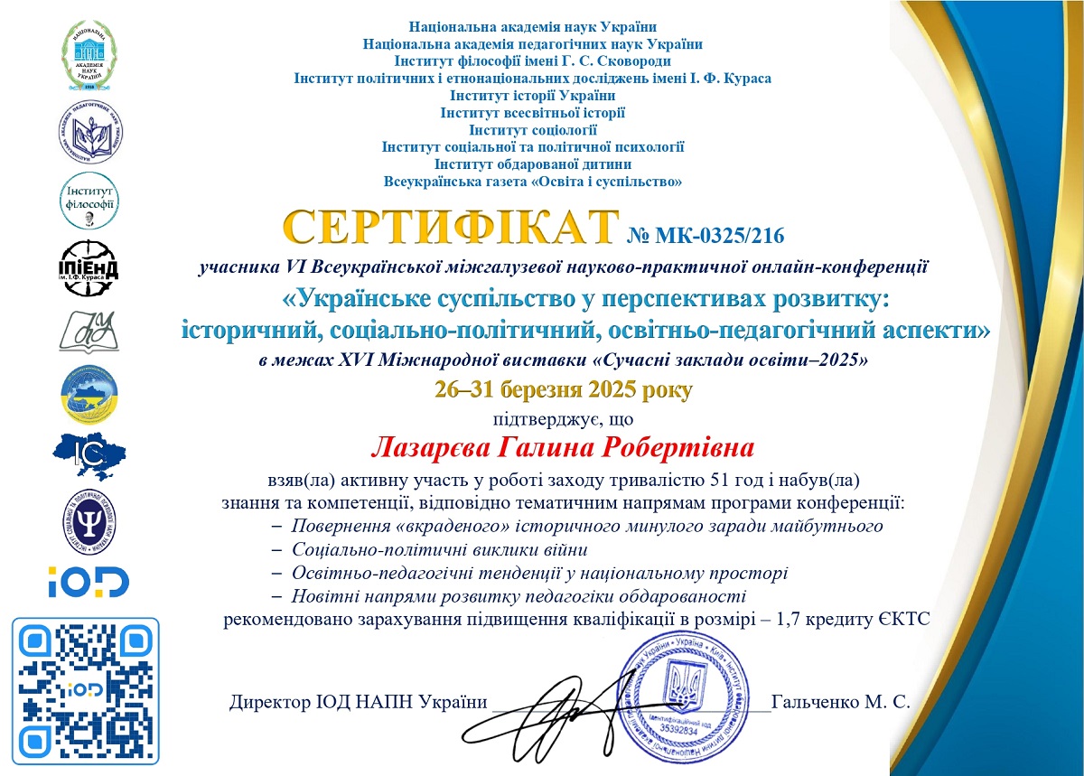 26-31 березня в межах ХVІ Міжнародної виставки «Сучасні заклади освіти — 2025» відбулася VІ Всеукраїнська міжгалузева науково-практична онлайн-конференція «Українське суспільство у перспективах розвитку: історичний, соціально-політичний, освітньо-педагогічний аспекти».