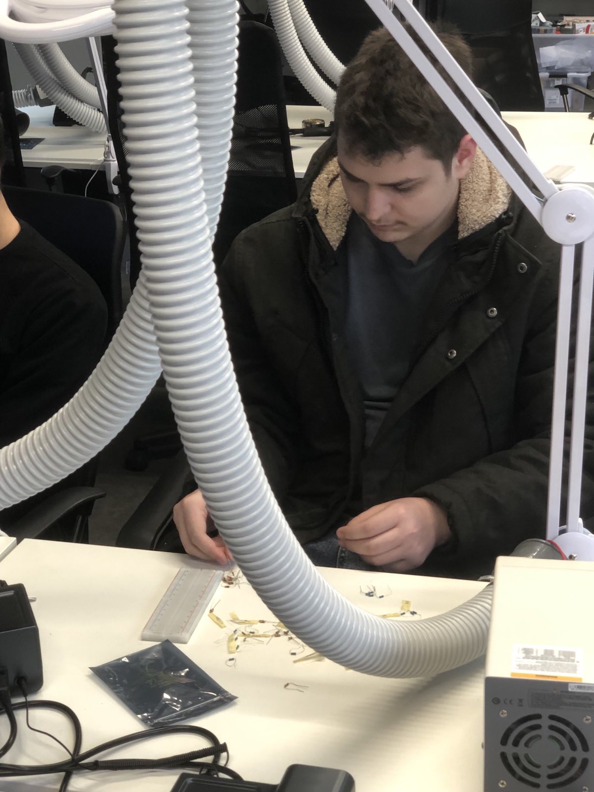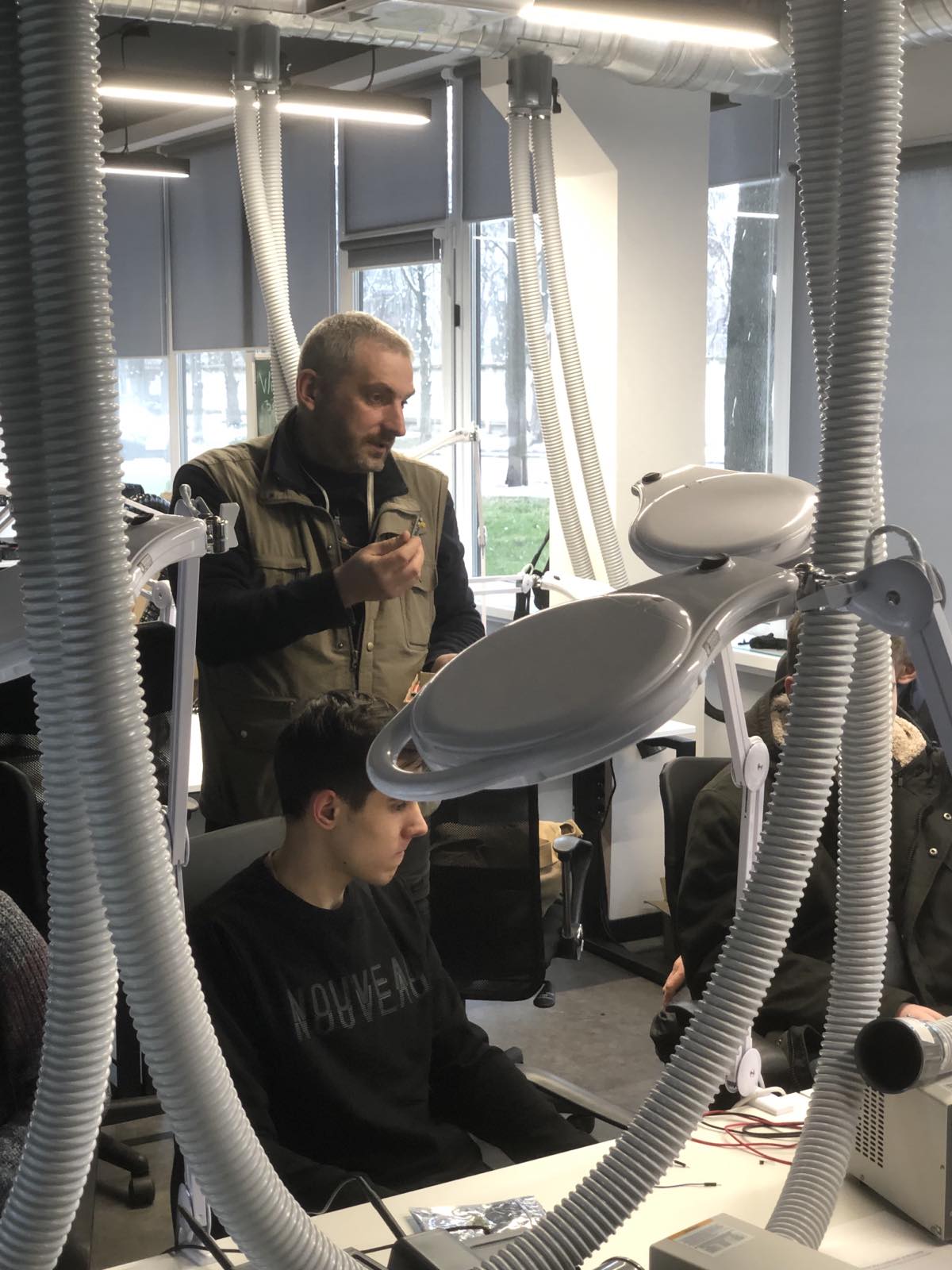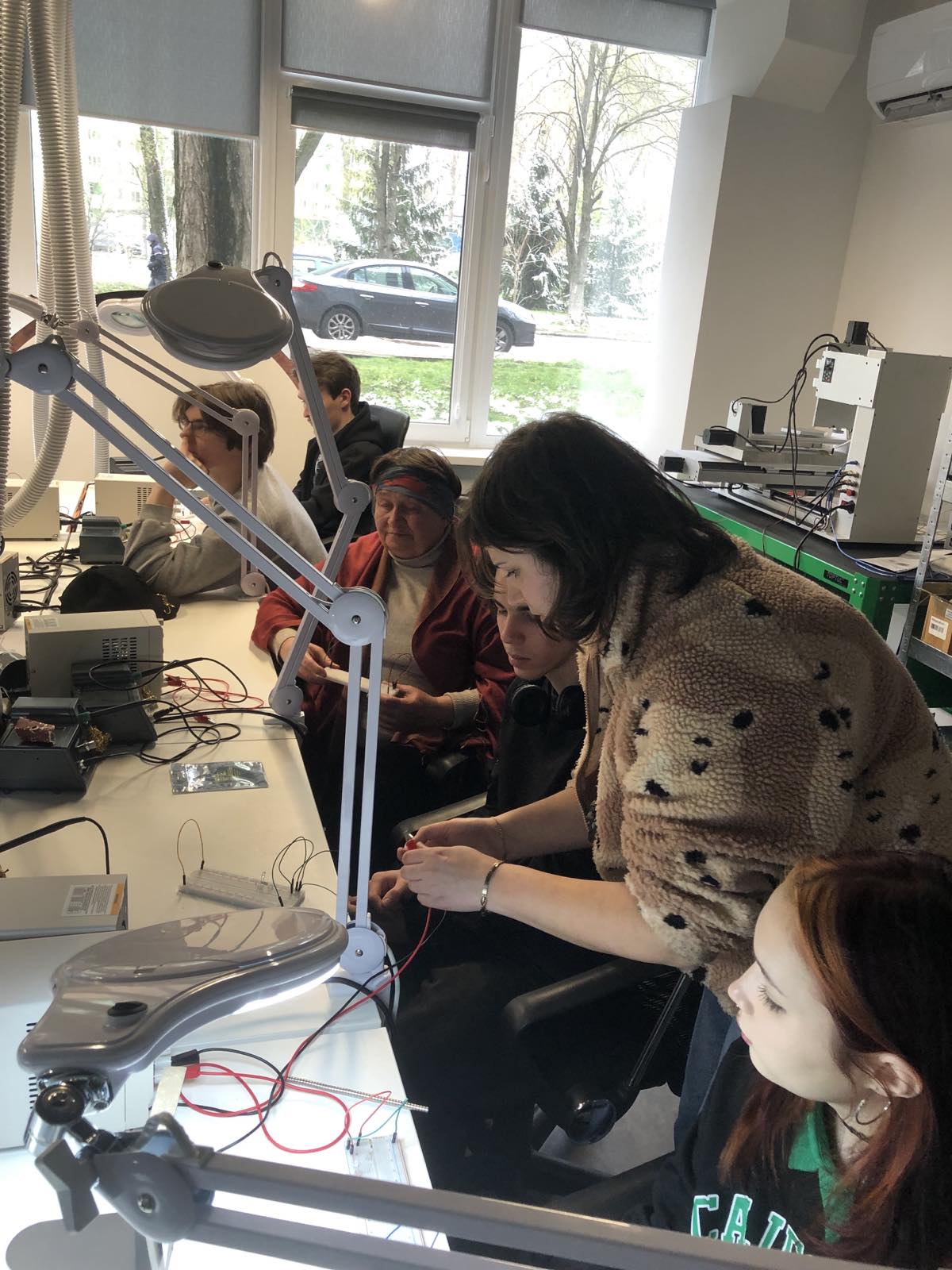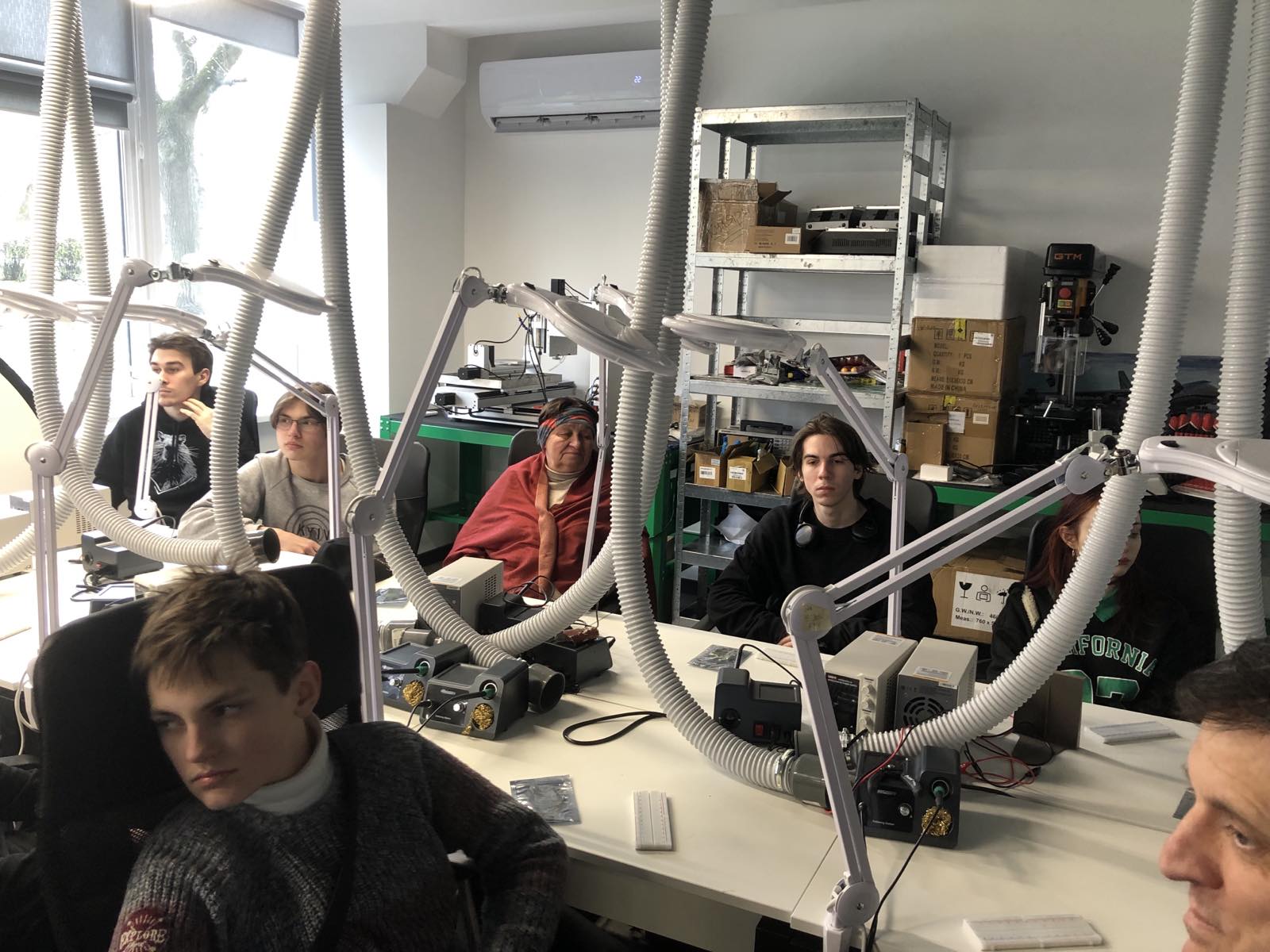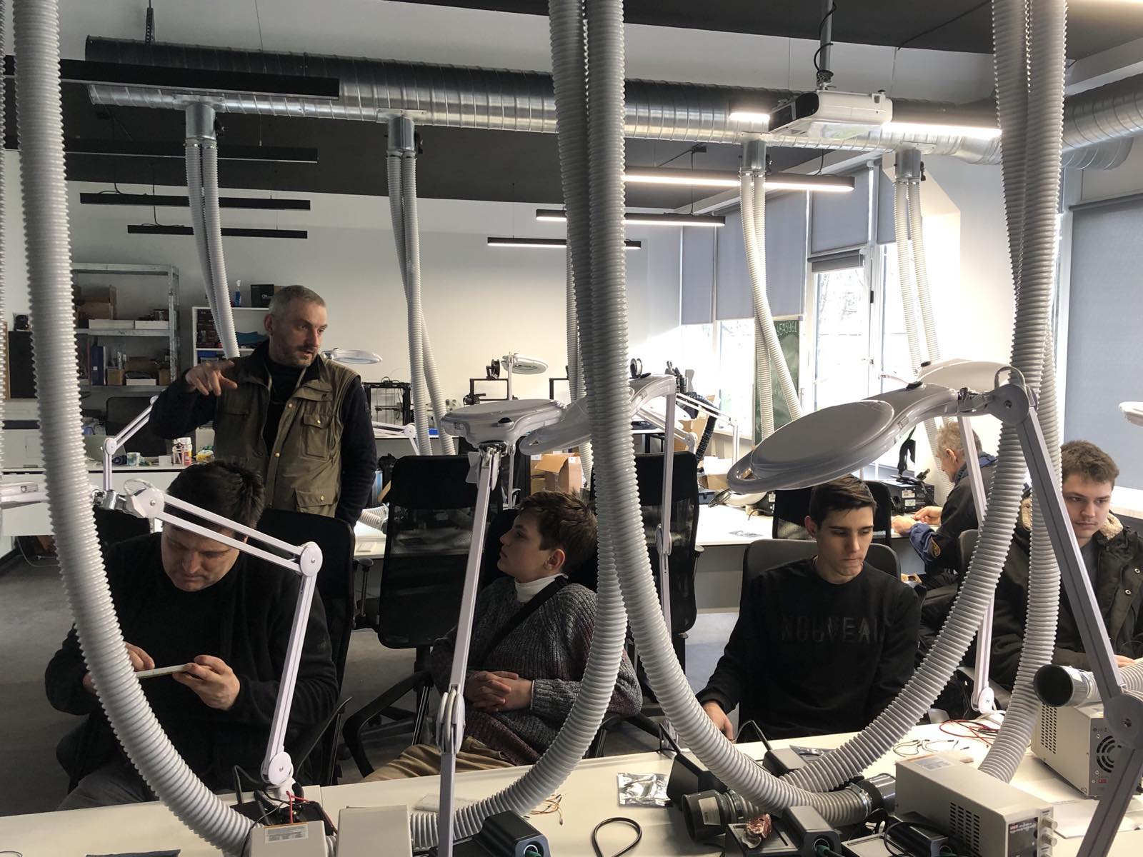 Гостей зустріла – Галина Лазарєва, директор ННІРО КАІ, заслужений працівник освіти України. Гуртківців ознайомили з лабораторією, яка вміщує обладнання, що необхідно для реалізації новітніх ідей: комп’ютерну техніку, мікроконтролери, елементну базу, оптичні прилади, 3D-принтери тощо, а також зі спеціальностями кафедри АСУ, які пов’язані з електронікою, телекомунікаціями, авіонікою та інтернетом речей (IoT).