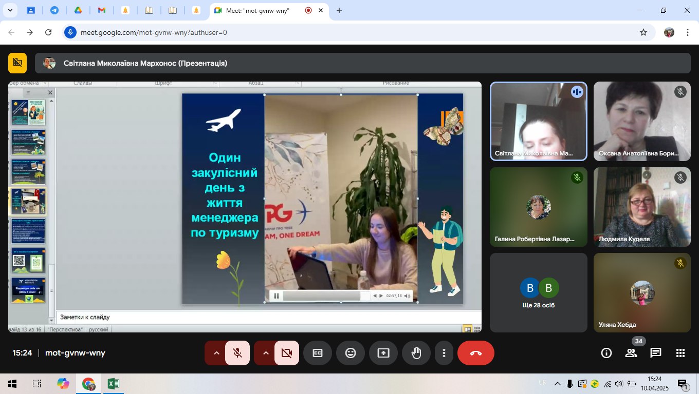 10 квітня 2025 року для студентів Фахового коледжу інженерії, управління та землевпорядкування Державного некомерційного підприємства «Державний університет «Київський авіаційний інститут», здобувачів освіти навчальних груп 132-Т, 591-Т, 567-Т спеціальності «Туризм» із дисциплін «Рекреаційна географія», «Географія туризму» (викладач Людмила КУДЕЛЯ) та «Спеціалізований туризм» (викладач Євгеній ЖУКОВСЬКИЙ) проведена дистанційна лекція «За лаштунками роботи менеджера з туризму».