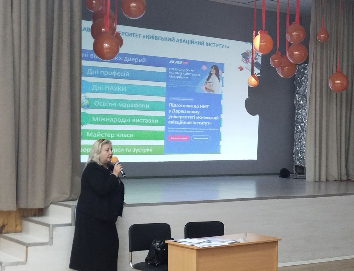 Тетяна Петровська розповіла про переваги і напрямки діяльності КАІ, про освітні і профорієнтаційні проєкти, ознайомила учнів із факультетами університету, запросила ліцеїстів відвідати новітні лабораторії, Музей історії авіації, навчальний ангар та стати слухачами Підготовчих курсів для майбутніх абітурієнтів.