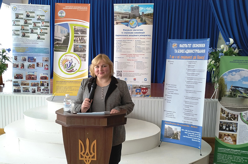 До уваги учнів був представлений виступ «НАУ-твоя мрія», презентувала університет директор Центру обдарованої учнівської молоді Людмила Куделя, яка привітала учасників заходу від імені ректора НАУ Володимира Ісаєнко та директора НН інституту інноваційних освітніх технологій Наталії Муранової. Змістовний виступ не тільки інформував абітурієнтів про структуру університету, переваги навчання в ньому, різнопланову діяльність, але й зосередив увагу на аспектах забезпечення якості вищої освіти, можливості ґрунтовної підготовки на кафедрі базових і спеціальних дисциплін до ЗНО, можливості долучитися до наукової, науково-дослідницької діяльності в НАУ шляхом участі молоді в освітніх проєктах (програмах), наукових школах, олімпіадах, що проводяться в університеті на безоплатній основі.