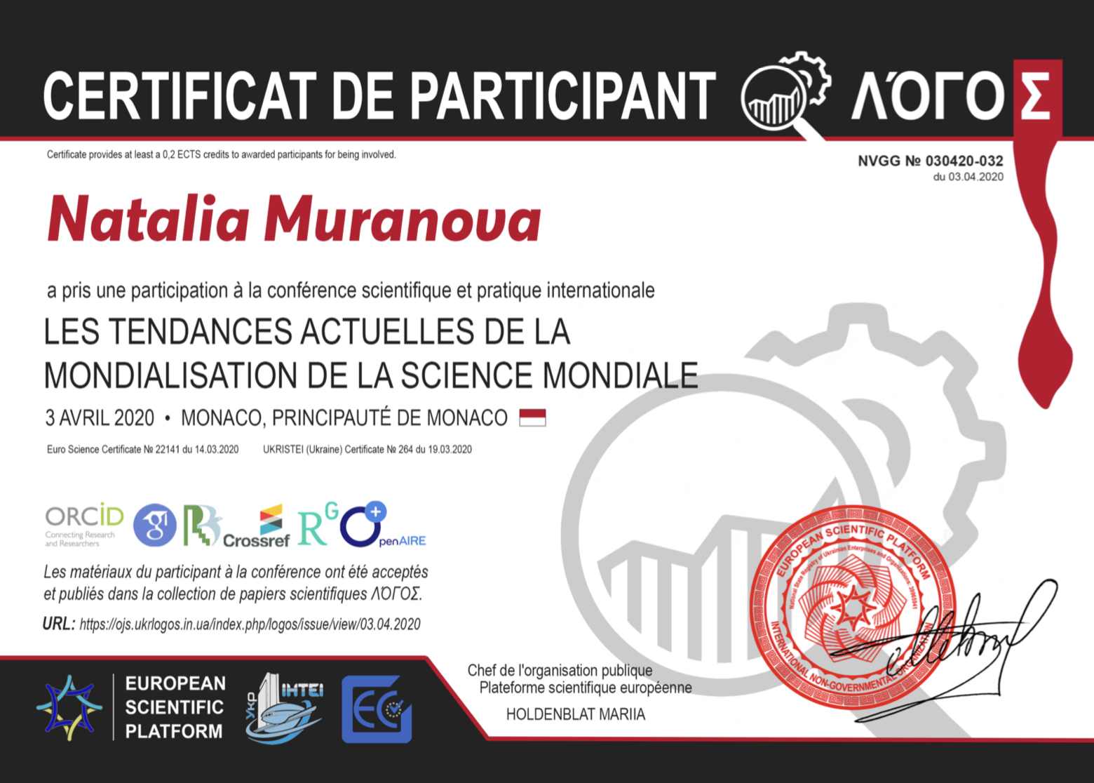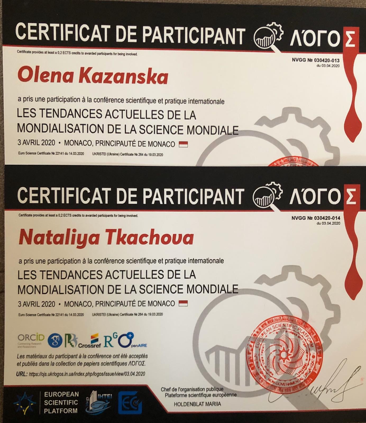 3 квітня 2020 року в Князівстві Монако на онлайн платформі ukrlogos.in.uaвідбулася Міжнародна науково-практична інтернет-конференція «Сучасні тенденції глобалізації світової науки» («Les tendances actuelles de lamondialisation de la science mondiale»).