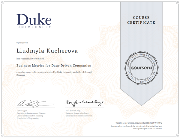 Завідувач лабораторії електронних засобів дистанційного навчання інституту Людмила Кучерова вже успішно завершила курс і отримала Сертифікат. Нею пройдено перший курс Business Metrics for Data-Driven Companies із спеціалізації Excel to MySQL: Analytic Techniques for Business, на якому вивчено кращі практики використання аналітики даних, щоб зробити будь-яку компанію більш конкурентоспроможною та вигіднішою. Курс навчив розпізнавати найважливіші бізнес-показники, отримали чітке уявлення про життєво важливі, але різні ролі бізнес-аналітиків, аналітиків бізнес-даних та науковців з даних у різних компаніях. Використовуючи список з 20 пунктів для оцінки бізнесу, можна оцінити будь-яку компанію щодо того, наскільки ефективно вона використовує масив даних. Цифрові компанії, такі як Amazon, Uber та Airbnb, змінюють цілі галузі, завдяки креативному використанню великих даних. Стало зрозуміло, як ці компанії використовують методи аналізу даних, щоб випереджати інші компанії. Вітаємо колегу! Бажаємо їй подальших здобутків!